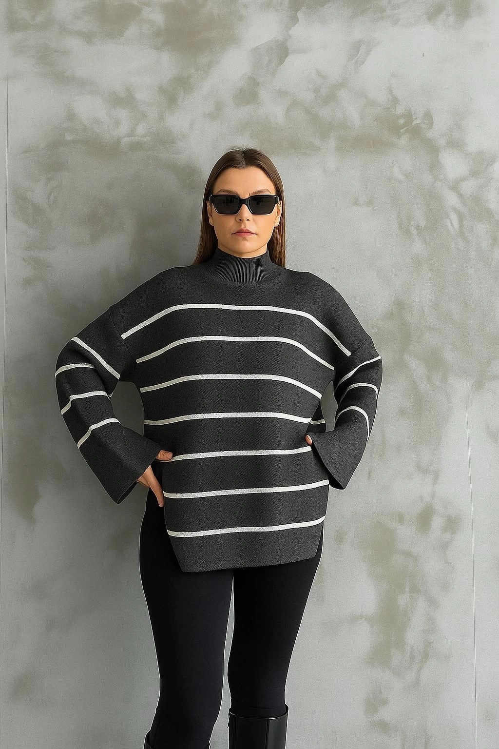 Çizgili ispanyol kol triko boğazlı kazak antrasit elf--İspanyol tarzını yansıtan çizgili boğazlı kazak, gardırobunuzun vazgeçilmezi olmaya aday! Tasarımındaki zarif detaylar ve kaliteli kumaşıyla, şıklığı ve konforu bir arada sunar. Antrasit rengi, her kombinle kolayca uyum sağlar ve şıklığınıza şıklık katar. İspanyol tarzı tasarım Çizgili desen Boğazlı kesim Antrasit renk Kaliteli kumaş