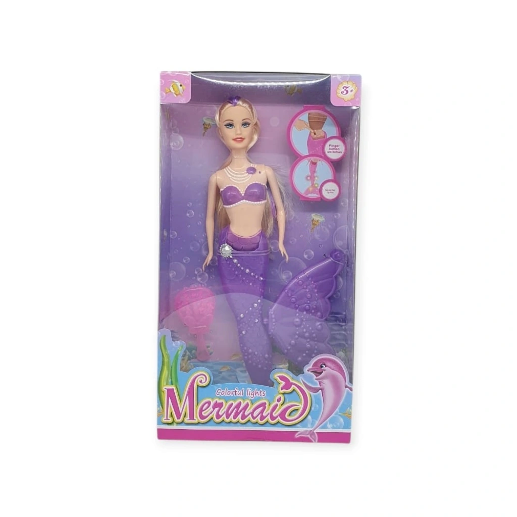 Deniz Kızı Işıklı Bebek - 2348/1-3 - MorDeniz kızı kuyruğuyla beraber 34 cm boyutundadır.Paket içerisinde deniz kızıyla birlikte 1 adet tarak aksesuarı çıkmaktadır.Arkasında bulunan açma -kapama düğmesi ile ışıkları yanmaktadır.Deniz kızı kafa kısmı et , kalan kısımlar sert plastik malzemeden üretilmiştir.Piller ürün içerisinde bulunmaktadır.