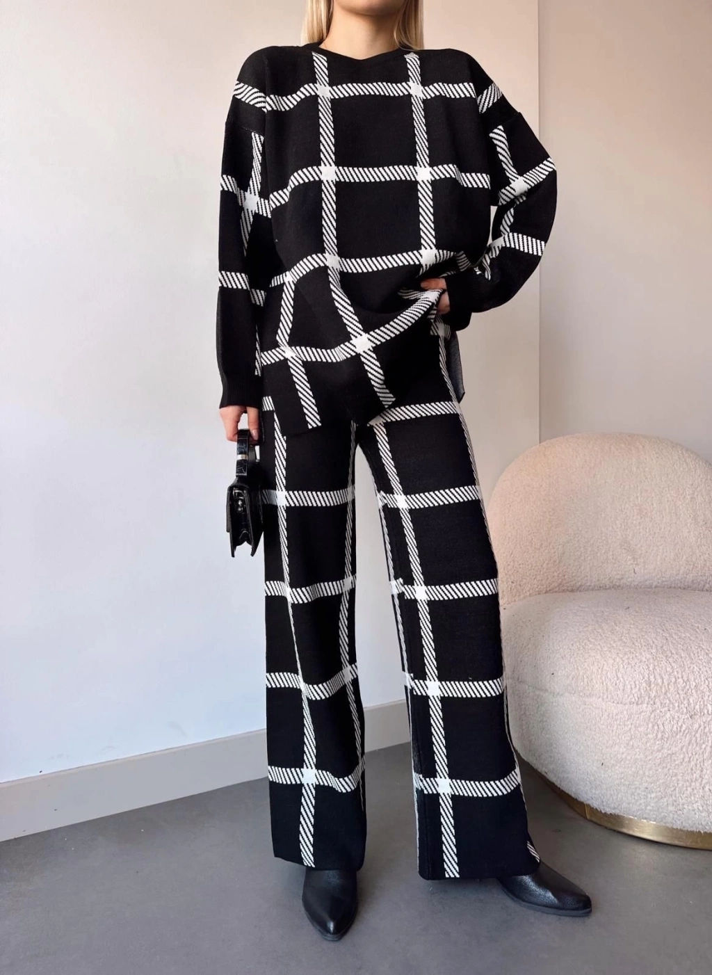 Ekoseli triko takım siyahbeyaz--Şıklığı ve rahatlığı aynı anda yaşamak isteyen kadınlar için ideal bir seçenek olan Siyahbeyaz Ekoseli Triko Takım, gardırobunuzun vazgeçilmezi olmaya aday. Ürün Özellikleri: Kaliteli triko kumaştan üretilmiştir. Klasik siyah ve beyaz renklerin şık kombinasyonuyla dikkat çeker. Ekoseli deseniyle modern ve şık bir görünüm sunar. İki parçadan oluşan takım, kombin yapmayı kolaylaştırır. Rahat kesimi ve esnek yapısıyla gün boyu konfor sağlar. Her mevsim rahatlıkla kullanabileceğiniz şık ve trend bir seçenektir. Siyahtan vazgeçemeyenlerin ve şıklıktan ödün vermeyenlerin tercihi olan bu triko takım, iş hayatında, günlük hayatta veya özel davetlerde şık ve zarif bir görünüm elde etmenize yardımcı olacaktır.