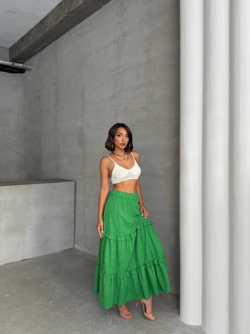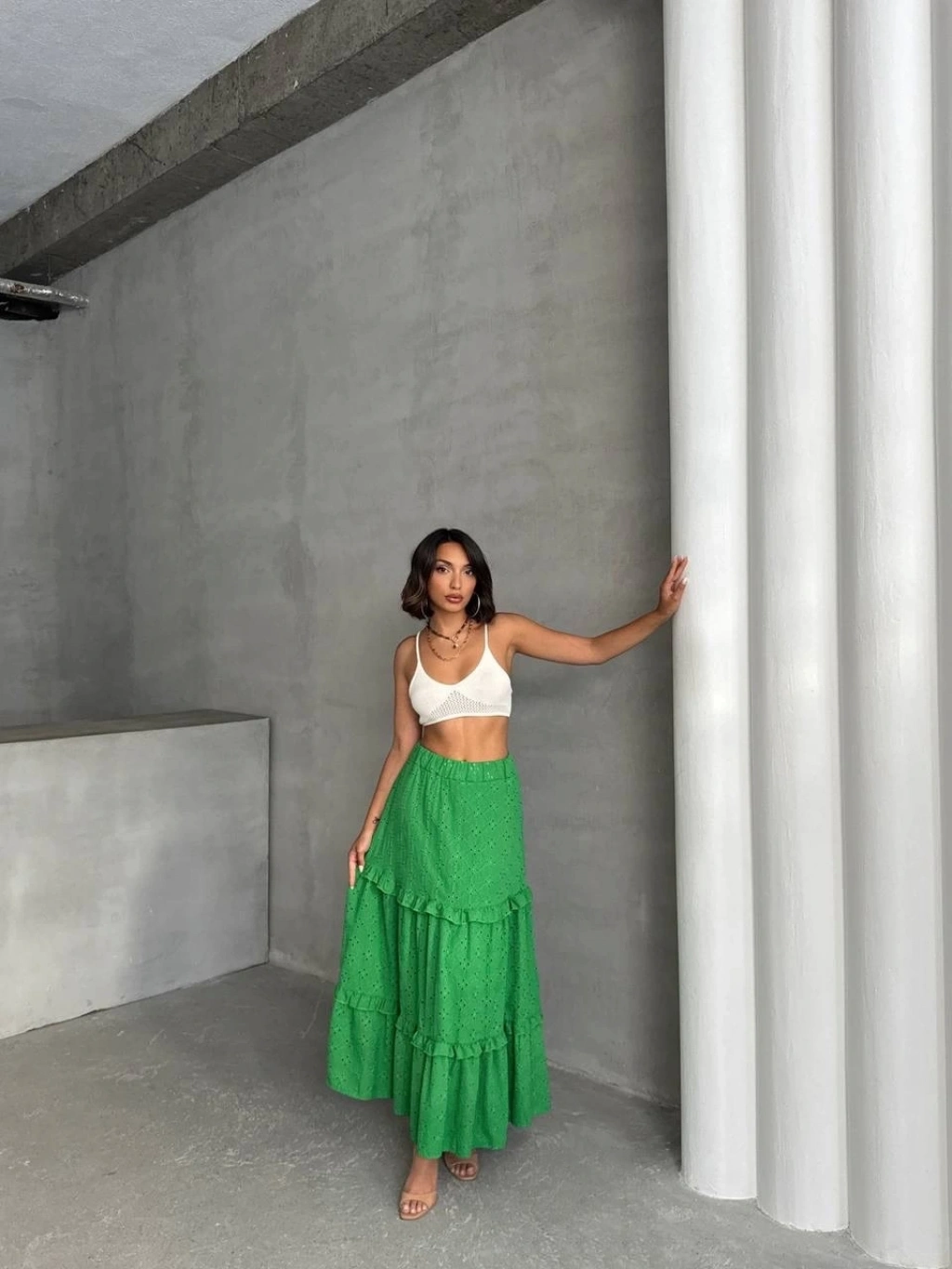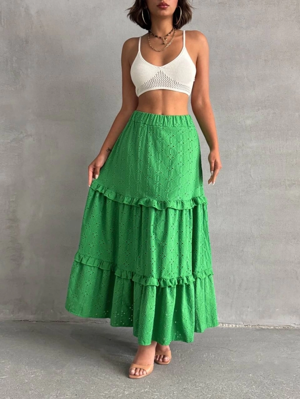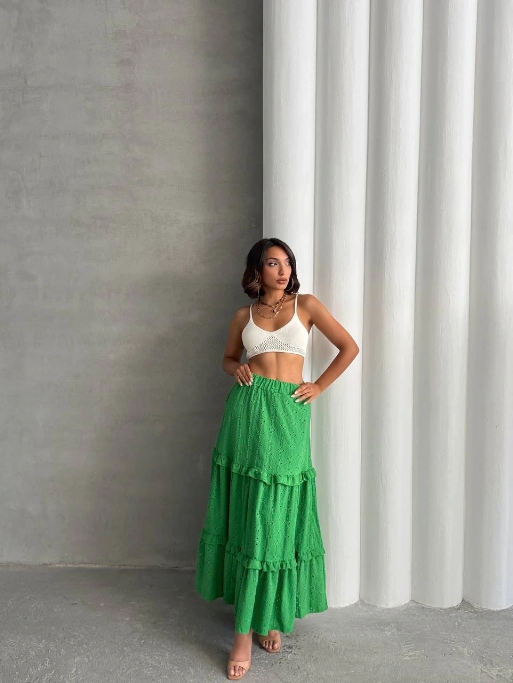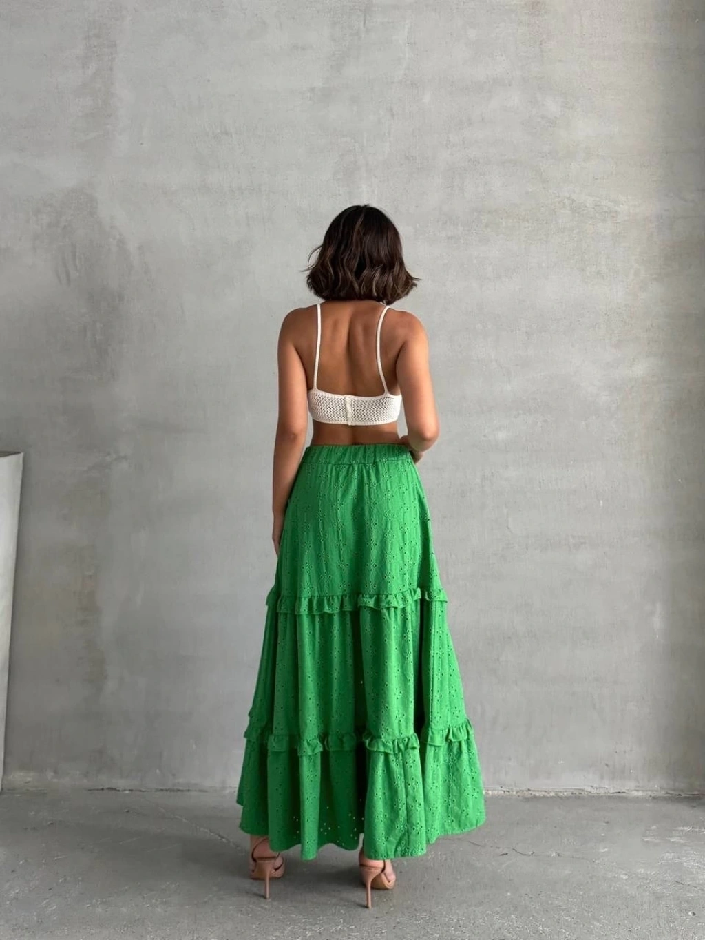 Fırfırlı brodeli astarlı uzun etek yeşil s255047--Bu sezonun trendi olan fırfırlı detaylarla hareket katan yeşil uzun eteğimiz, gardırobunuzun vazgeçilmezi olmaya aday! Çift taraflı brode işlemeleri ile şıklığı ve zarafeti bir arada sunan tasarım, her durumda size şıklık katacak. Astarlı yapısı sayesinde rahatça kullanabileceğiniz eteğimiz, şık bluz ve topuklu ayakkabılarla kombinleyerek göz ştırıcı bir görünüm elde etmenizi sağlayacak. Fırfırlı detaylarla hareket kazandırılmış tasarım Çift taraflı brode işlemeler Yüksek bel kesim Astarlı yapısıyla konforlu kullanım Şık bluz ve topuklu ayakkabılarla kombinlenebilir