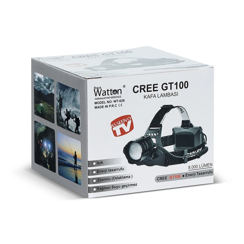 GT100 Led Şarjlı Kafa Lambası WT-628 Ürün Kodu :Wt-628 Boyut :Uzunluk 5 cm Ön Yüzey 4cm Işık Özelliği :GT100 Led ( 8000 LÜMEN ) Işık Mesafesi :250/300 mt Işık Rengi :Beyaz Çalışma Süresi :2-4-6 SAAT Gövde Malemsi :Gövde Alüminyum Metal Pil Yuvası Plastik Kullanım Şekli :3 Mod Aydınlatma Orta Yüksek ve Sellektör Kullanım Özellikleri :Kafada Esnek Lastiği İle Kolay Sabitlenme Teknik Özellikleri :Şarj Edilebilir Pil Kutu İçeriği :Ürün Usb Şarj kablosu 2 Adet Şarj Edilebilir Pil Ampül Ömrü :100.000 Saattir Kullanım Yeri :Av, Kamp, Araba, Otel, Restorant Tasarruflu Enerji Harcama Özelliği Önemli Uyarılar :Direk Göz İle Temas Ettirmeyiniz Kullanmadığınız Süreçte İçinde Pil Bırakmayınız