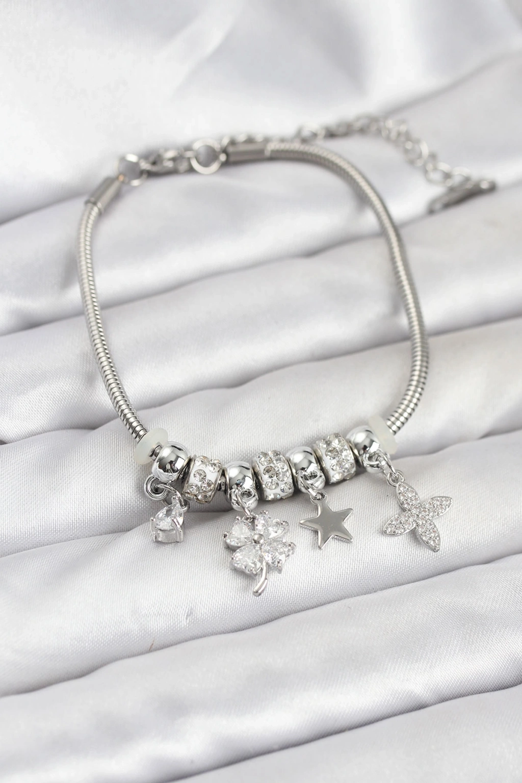 Gümüş Renk Pirinç Yonca Charmlı Kadın Bileklik