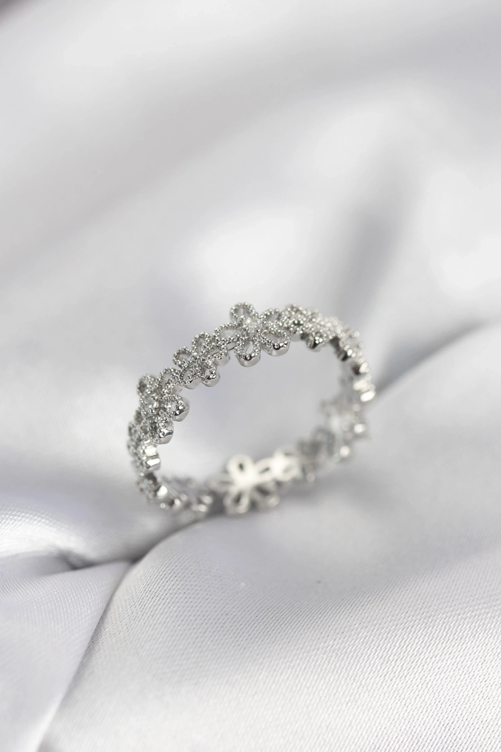 Gümüş Renk Sıralı Çiçek Model Zirkon Taşlı Kadın Yüzük