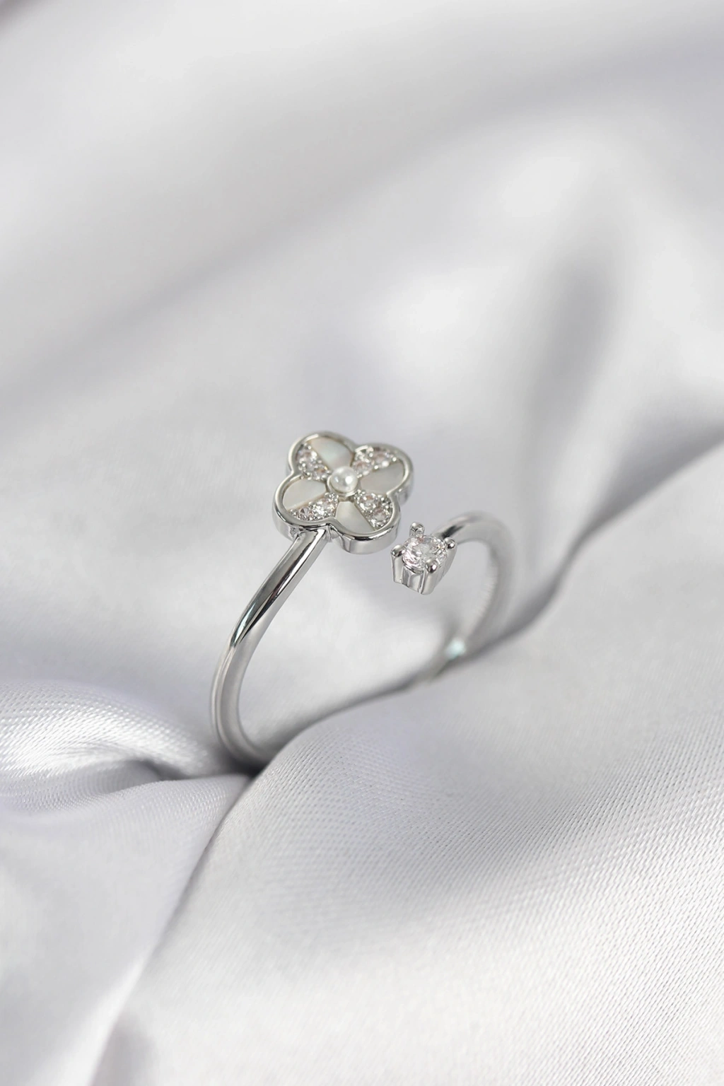 Gümüş Renk Zirkon Taşlı Yonca Model Kadın Yüzük