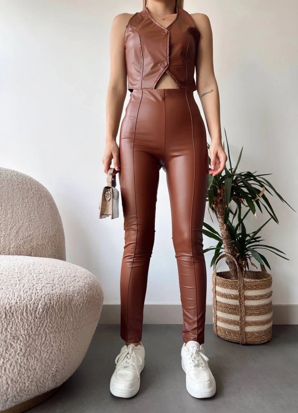 İki düğmeli deri yelek kahve --Şık ve modern tasarımıyla dikkat çeken Kahve rengi İki Düğmeli Deri Yelek, gardırobunuzun vazgeçilmezi olmaya aday! İnce deri malzemesi sayesinde hafif bir yapısı olan bu yelek, yaz ve bahar aylarında rahatlıkla kullanabilirsiniz. Yeleğin iki düğme detayı hem şık bir görünüm sunarken hem de pratik bir kullanım sağlar. Kadın giyim kategorisinde yer alan bu yeleği eteklerle, pantolonlarla ya da elbiselerle kombinleyerek farklı tarzlar tabilirsiniz. Yeleğin standart beden olması, birçok farklı vücut tipine uyum sağlayabilmesini sağlar.