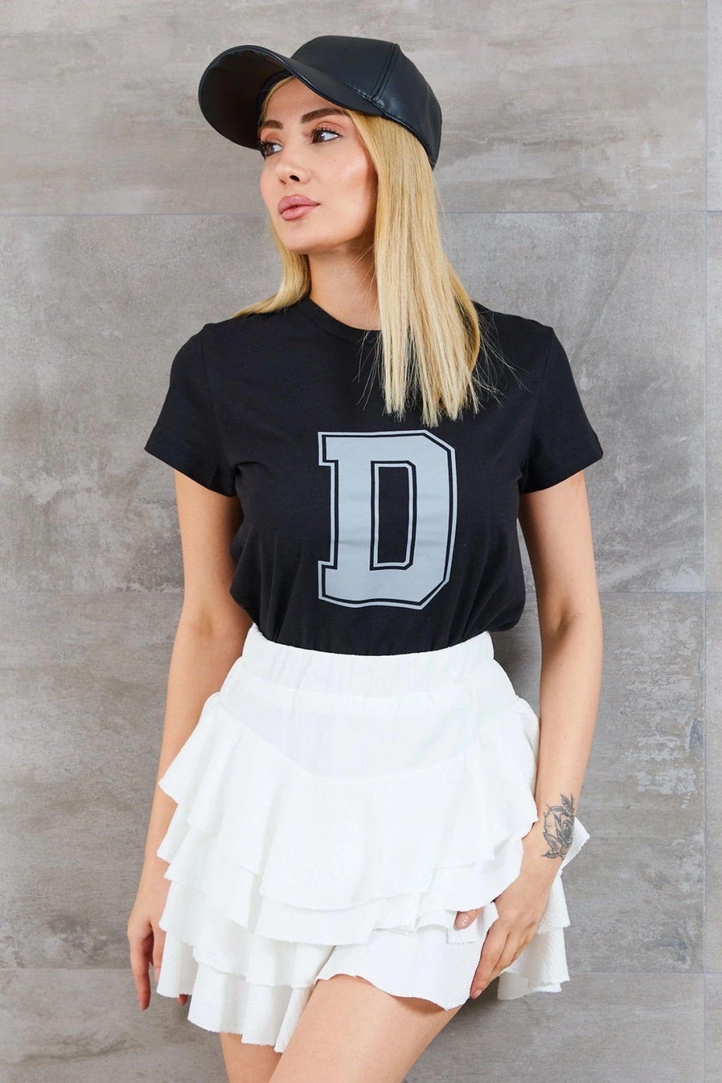 D Baskılı T-shirtÜrün Uzunluğu: 61 cm (1-3 cm arası değişiklik gösterebilir.)Ürün Genişliği: 44 cm (1-3 cm arası değişiklik gösterebilir.)Ürün Kol Uzunluğu: 14 cm (1-3 cm arası değişiklik gösterebilir.)Kumaş Türü: %100 PamukModelin üzerindeki ürün S bedendir.Modelin Ölçüleri:Boy:1,72 Kilo:50, Göğüs:85, Bel:60, Basen:95Sadelik ve tarz tek bir tişörtte buluştu!D harf baskılı tişört, sportif duruşu ve zamansız rengi ile dolabınızın vazgeçilmezi olacak. Yumuşak pamuk kumaşı ile konforlu bir kullanım sunarken, dikkat çekici harf detayı stilinize özgünlük katıyor.Kot pantolonla, şortla ya da etekle kombinleyerek günlük stilinize kolayca uyarlayabilirsiniz. Sokak modasından ilham alan bu tişört, rahatlığı ve şıklığı bir arada isteyen kadınlar için ideal.