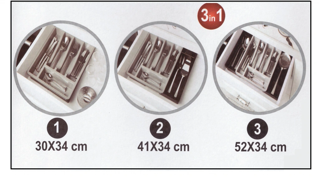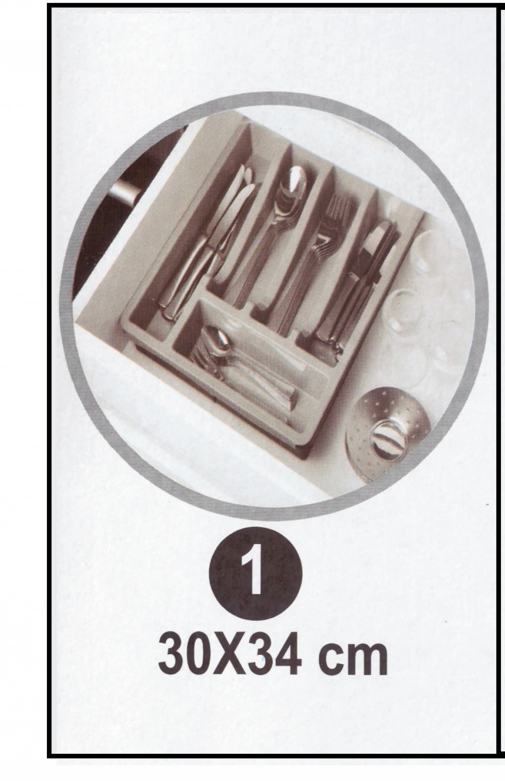 Kayar Kaşıklık Organizeri - 3 Aşamalı Sürgülü - Sağ Sol Açılır ; Kayar kaşıklık organizeri standart boyuttaki haznelere sığmayan masa, yemek kaşığı vb. gibi mutfak gereçlerinin düzenli bir şekilde çekmece içlerinde istiflenmesi için dizayn edilmiştirÜrün özellikleri Her çekmece ile kolayca uyum sağlar Kullanılmadığı durumlarda üst üste geçerek yer tasarrufu sağlar Ölçü: Genişlik: 30 cm x 34 cm 1 Taraf Açıkken : 41 cm x 34 cm 2 Taraf Açıkken : 52 cm x 34 cm Derinlik: 34 cm Yükseklik: 5 cm Paket İçeriği1 adet Kayar Kaşıklık Organizeri - 3 Aşamalı Sürgülü - Sağ Sol Açılır