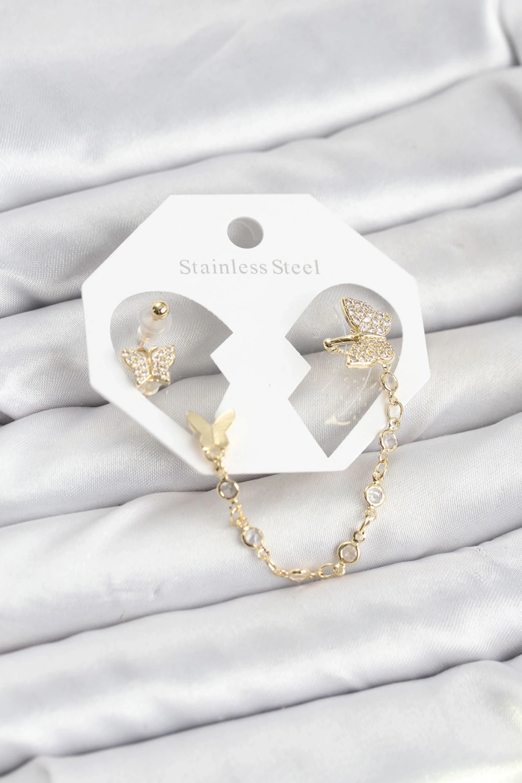 Kelebek Model Pirinç Gold Renk Zincir Bağlantılı Ear Cuff Küpe Seti