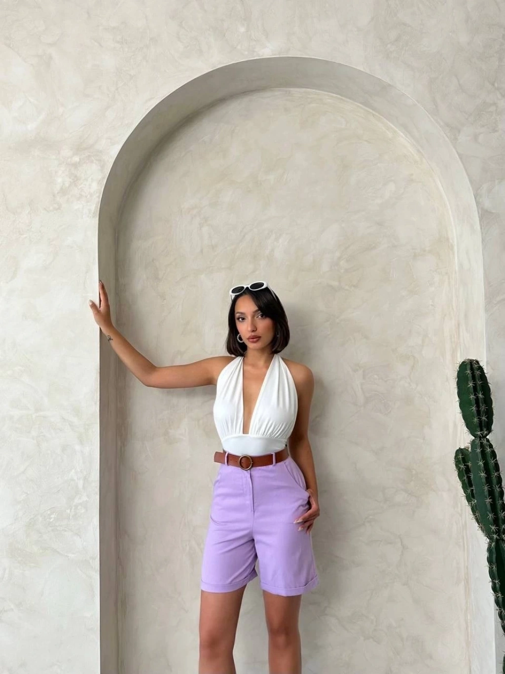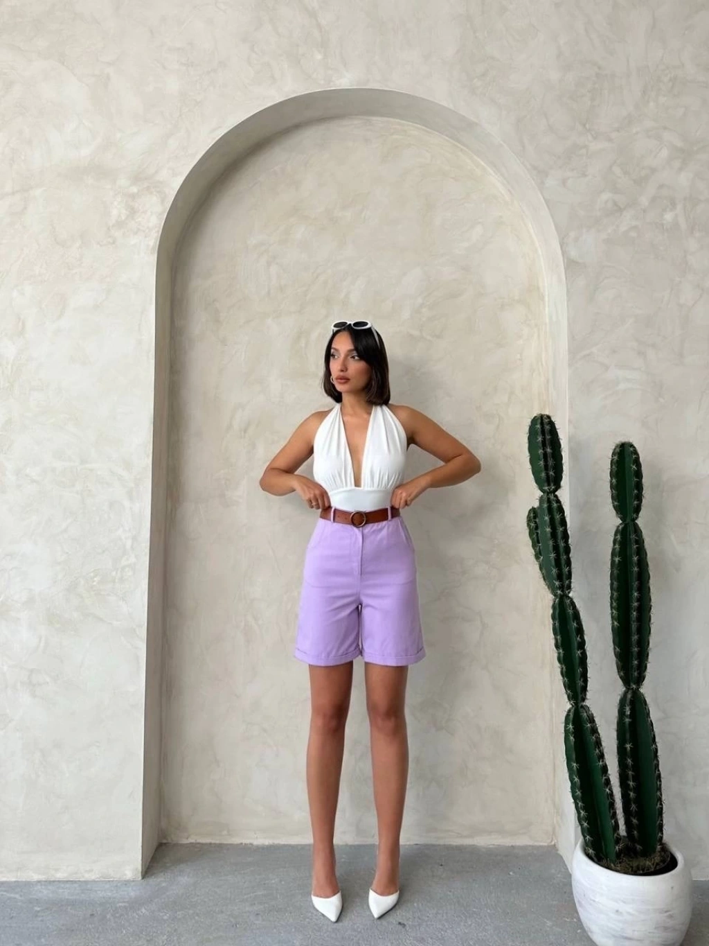 Kemerli gabardin şort lila s25735--Bu lila renkli kemerli gabardin şort, yaz aylarının vazgeçilmez parçası olmaya aday! Şıklığı ve rahatlığı bir arada sunan şort, gardırobunuzun favori parçalarından biri olmaya aday. Özellikleri: Kemer detayı ile şık bir görünüm sunar. Kaliteli gabardin kumaşı sayesinde uzun ömürlü kullanım ianı sağlar. Rahat kesimi ile hareket özgürlüğü sunar. Yüksek bel tasarımı ile vücudu sıkmaz, konforlu bir kullanım sağlar. Günlük kullanıma uygun şık tasarımı ile her kombinle rahatlıkla uyum sağlar.