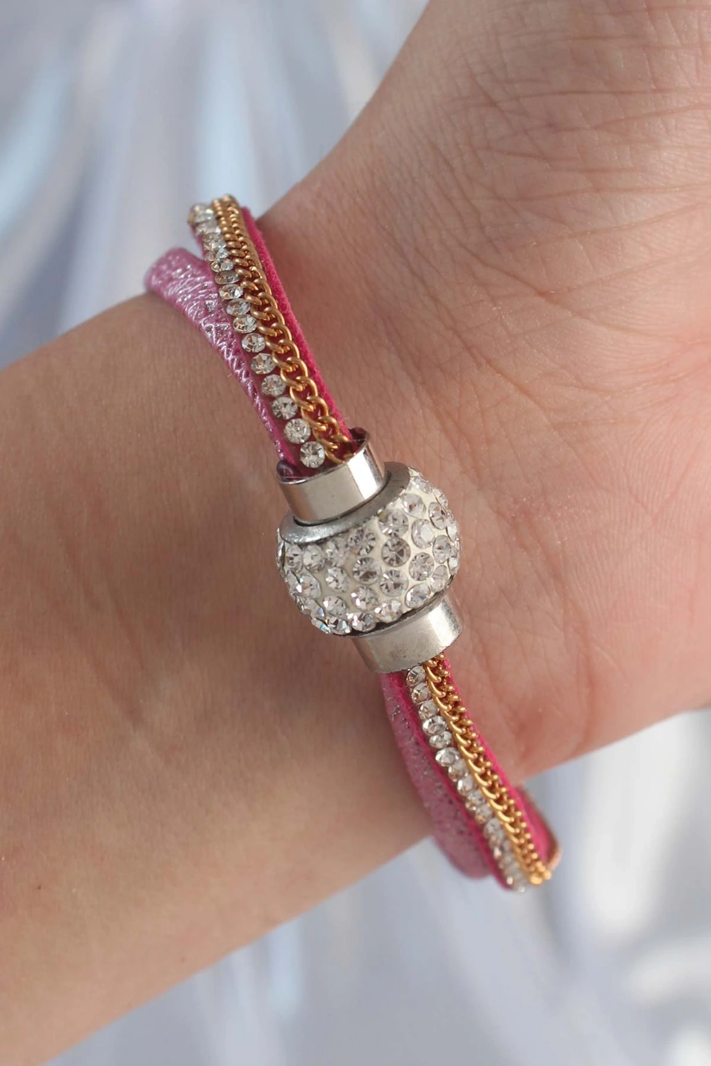 Pembe Renk Zirkon Taşlı Püskül Detay Deri Çoklu Bileklik
