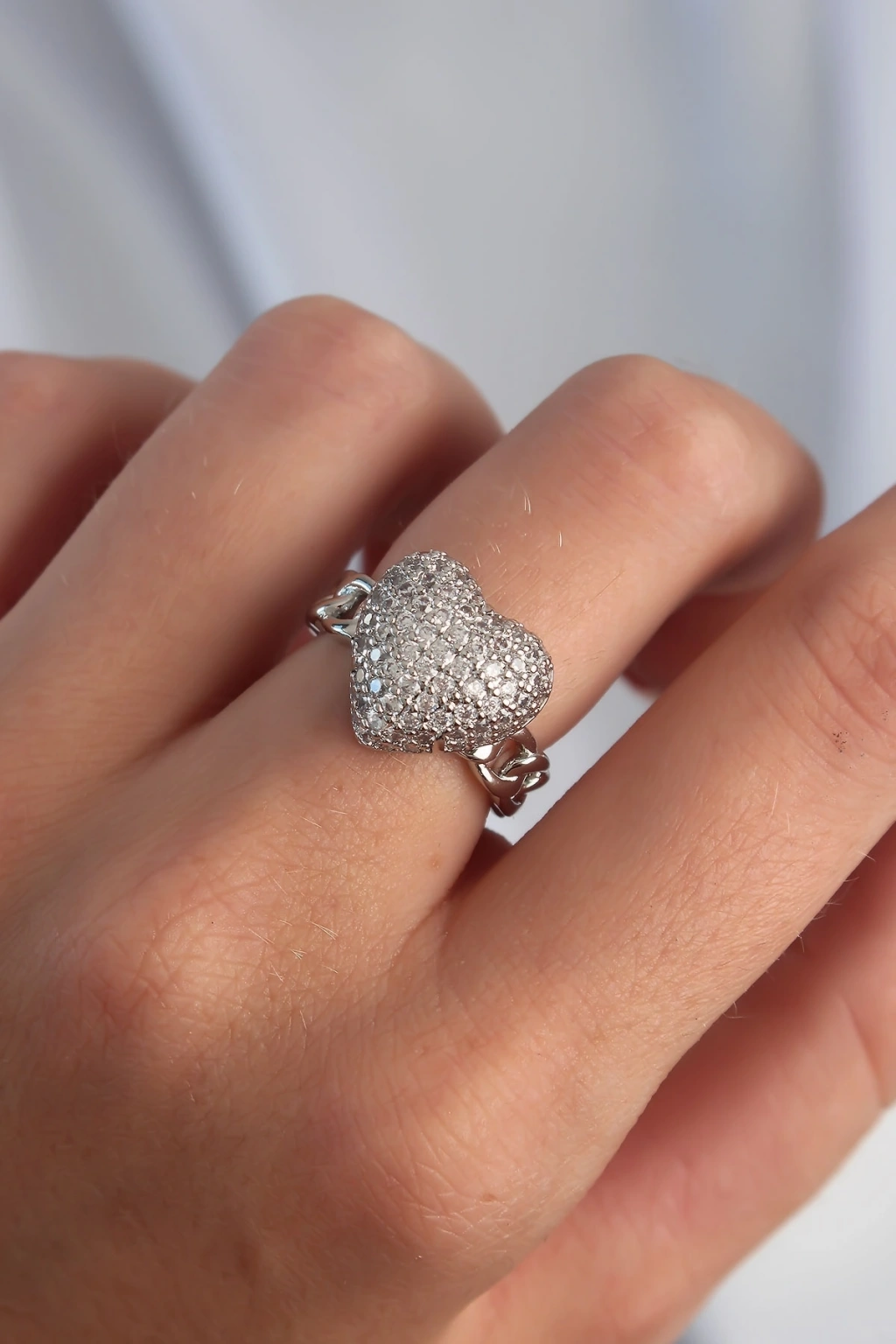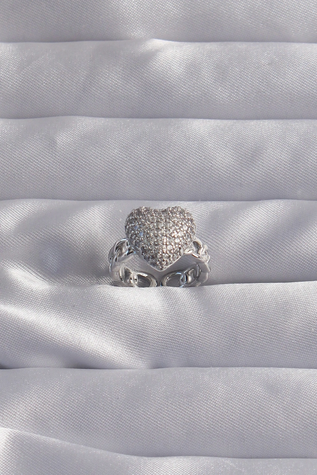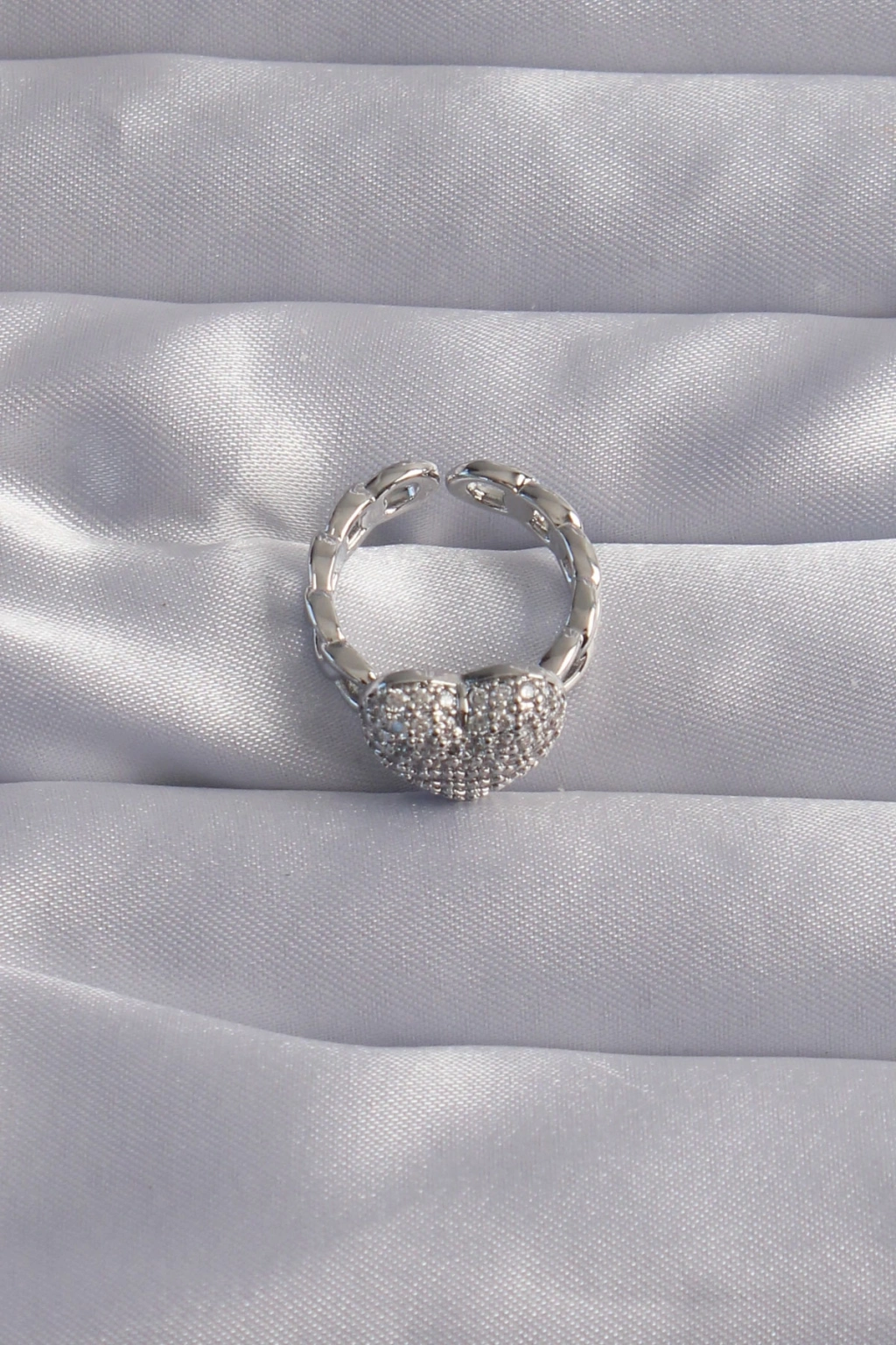 Pirinç Ayarlamalı Gümüş Renk Zirkon Taşlı Bombeli Kalp Yüzük