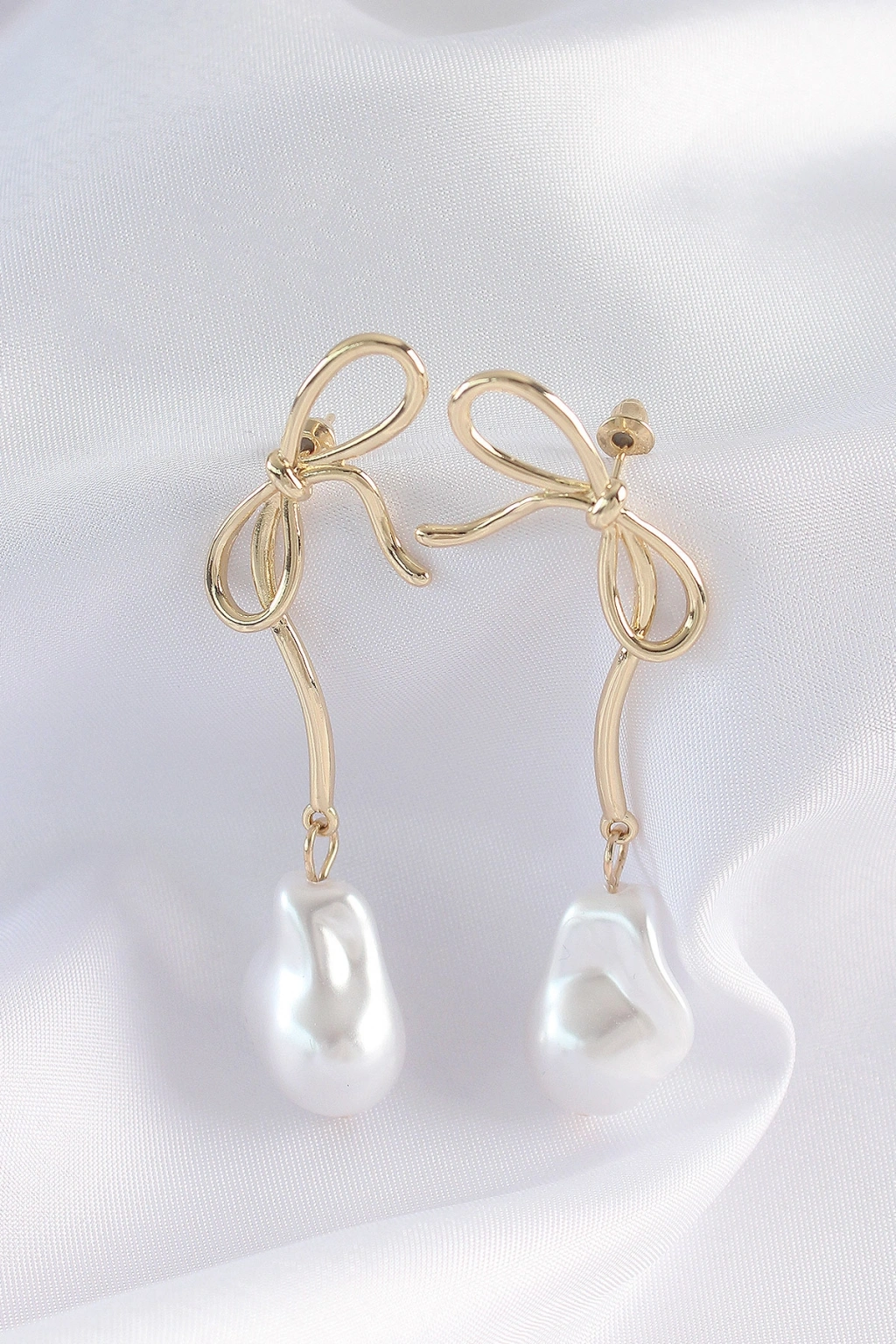 Pirinç Gold Renk Fiyonk Model İnci Taşlı Uzun Küpe