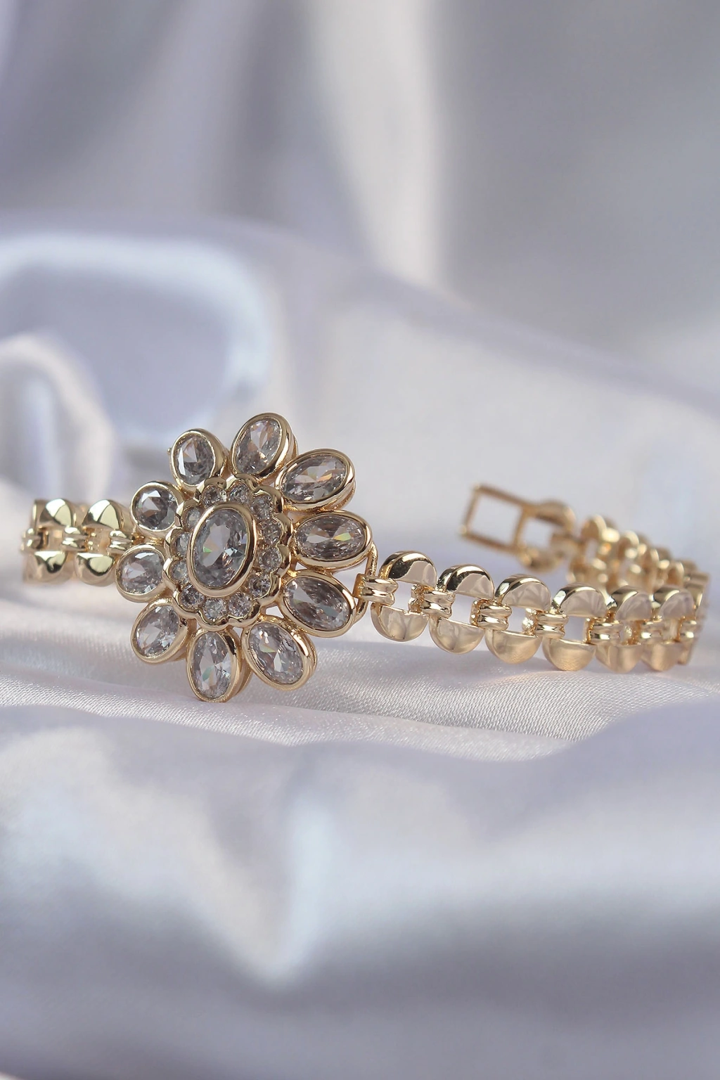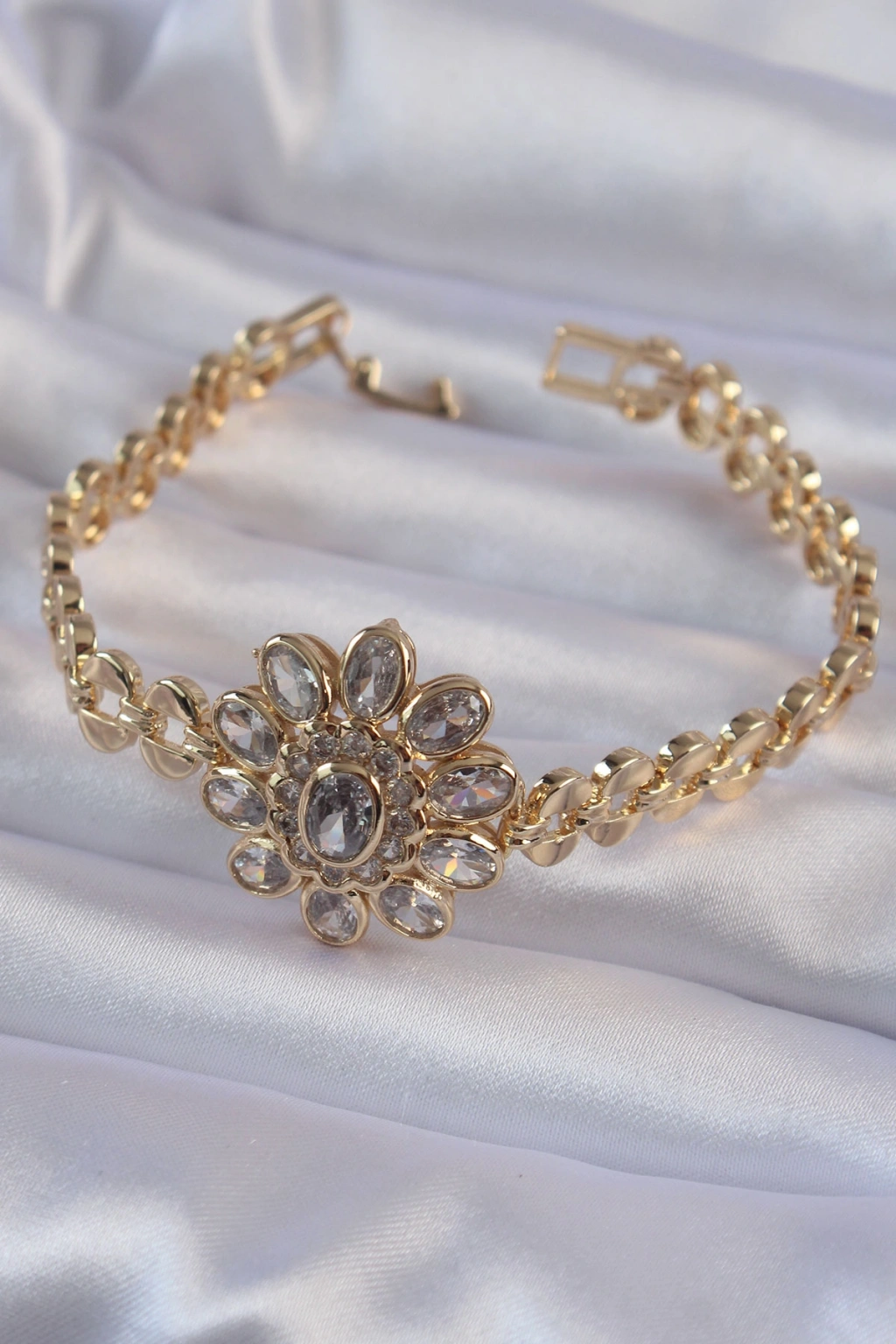 Pirinç Gold Renk İri Zirkon Taşlı Çiçek Figürlü Bileklik