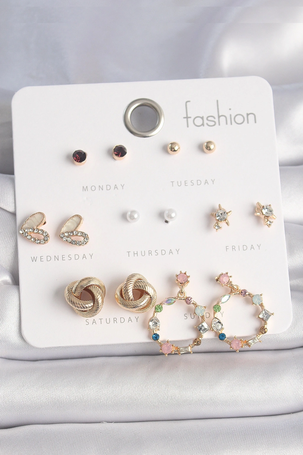 Pirinç Gold Renk Renkli Zirkon Taşlı Kalp Detay 7 Çift Kadın Küpe Seti