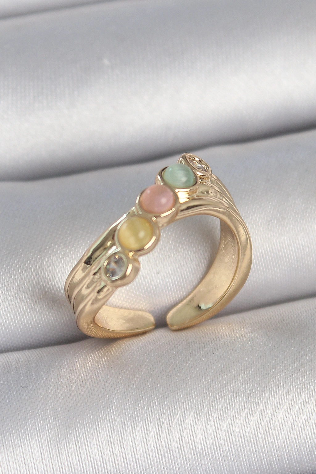 Pirinç Gold Renk Zirkon Taş Detaylı Karışık Mineli Ayarlanabilir Kadın Yüzük