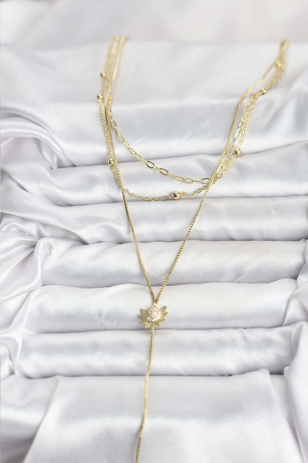 Pirinç Gold Renk Zirkon Taşlı Güneş Model Detaylı 3'lü Kombin Y Kadın Kolye