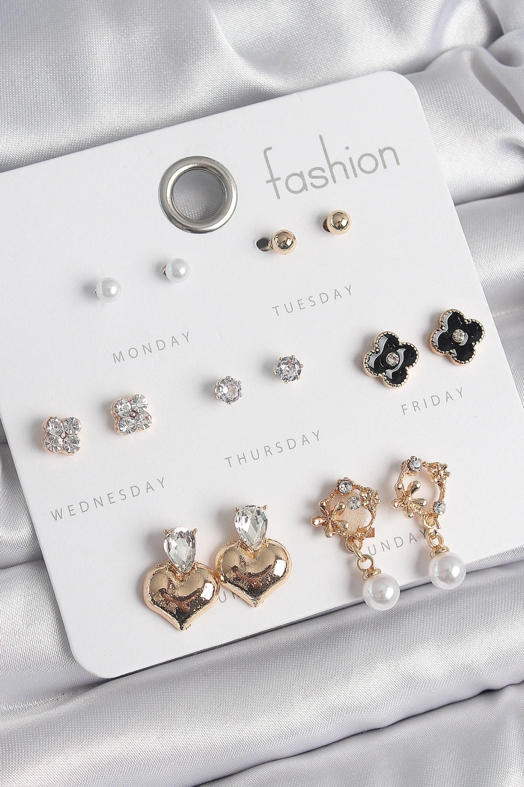Pirinç Gold Renk Zirkon Taşlı Kalp Figür Siyah Yonca Detay 7 Çift Kadın Küpe Seti