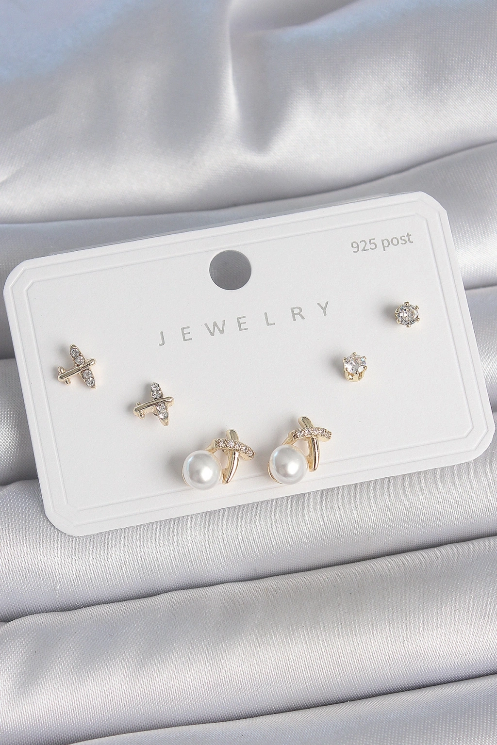 Pirinç Gold Renk Zirkon Taşlı Kelebek Model İnci Detay 925 Ayar Gümüş Çivi Kadın Küpe Seti