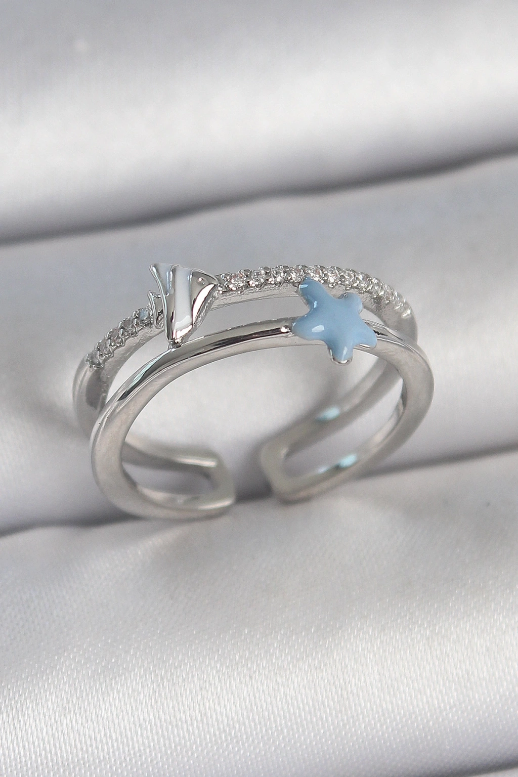 Pirinç Gümüş Renk 2'Li Zirkon Taşlı Mavi Yıldız Figür Ayarlanabilir Kadın Yüzük
