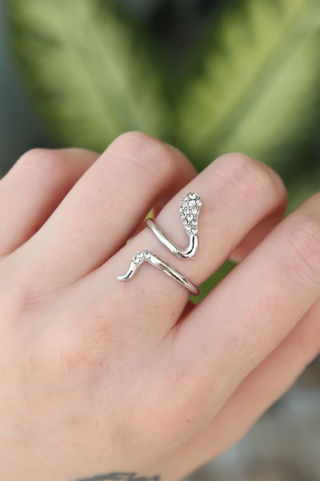 Pirinç Gümüş Renk Ayarlanabilir Zirkon Taşlı Yılan Yüzük