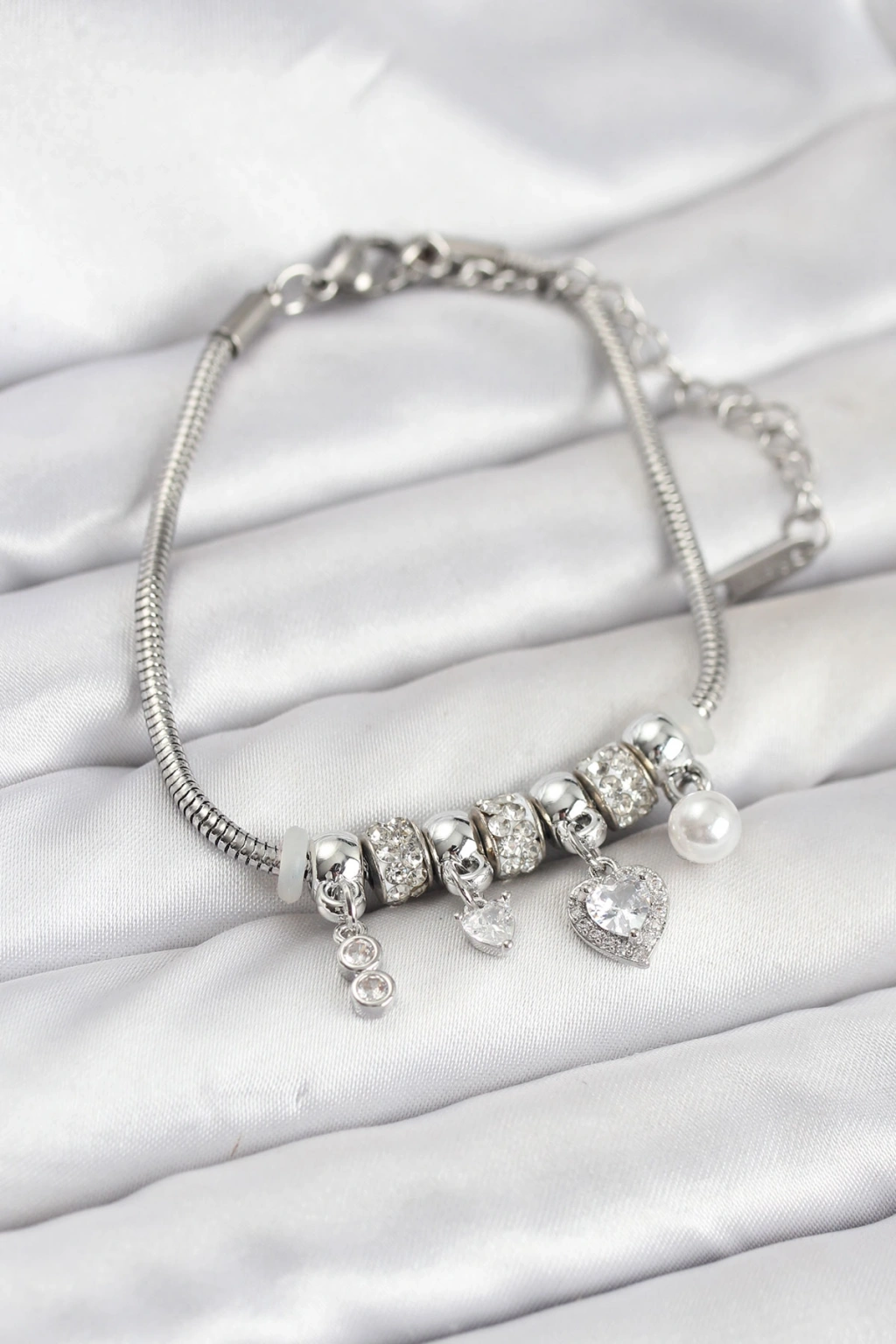 Pirinç Gümüş Renk Kalp Charmlı Kadın Bileklik