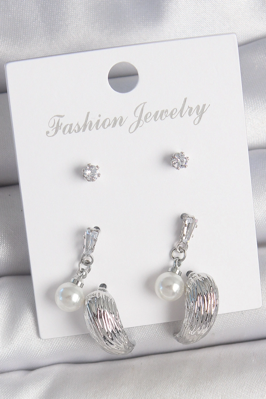 Pirinç Gümüş Renk Sallantılı Zirkon Taşlı Damla Model 3 Çift Kadın Küpe Seti