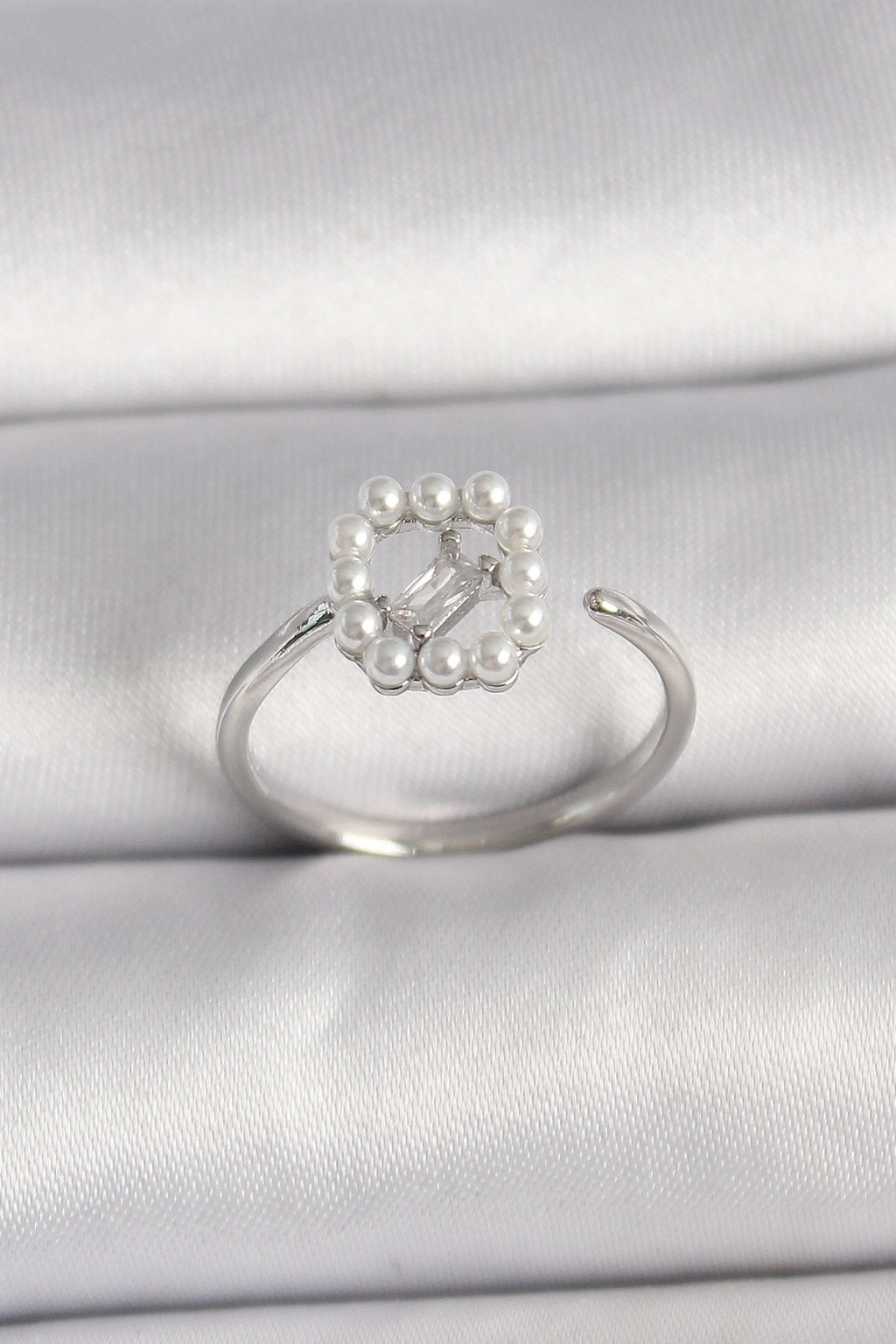 Pirinç Gümüş Renk Zirkon Taş Detaylı İncili Ayarlanabilir Yüzük