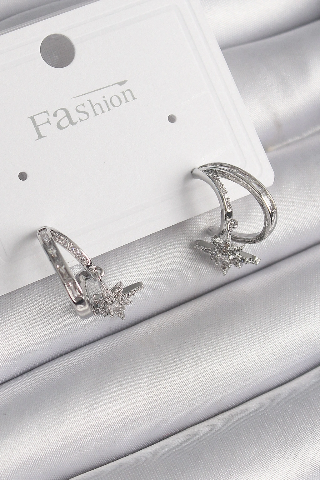 Pirinç Gümüş Renk Zirkon Taşlı Halka Model Sallantı Yıldız Detay Kadın Küpe