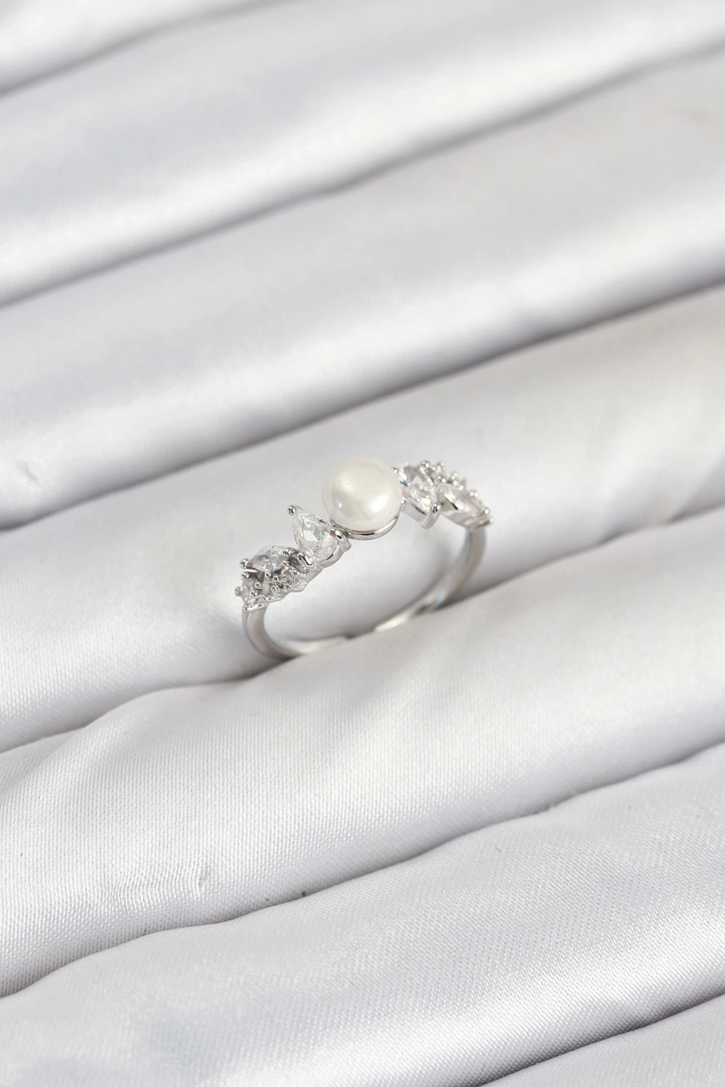 Pirinç Gümüş Renk Zirkon Taşlı İncili Model Kadın Yüzük