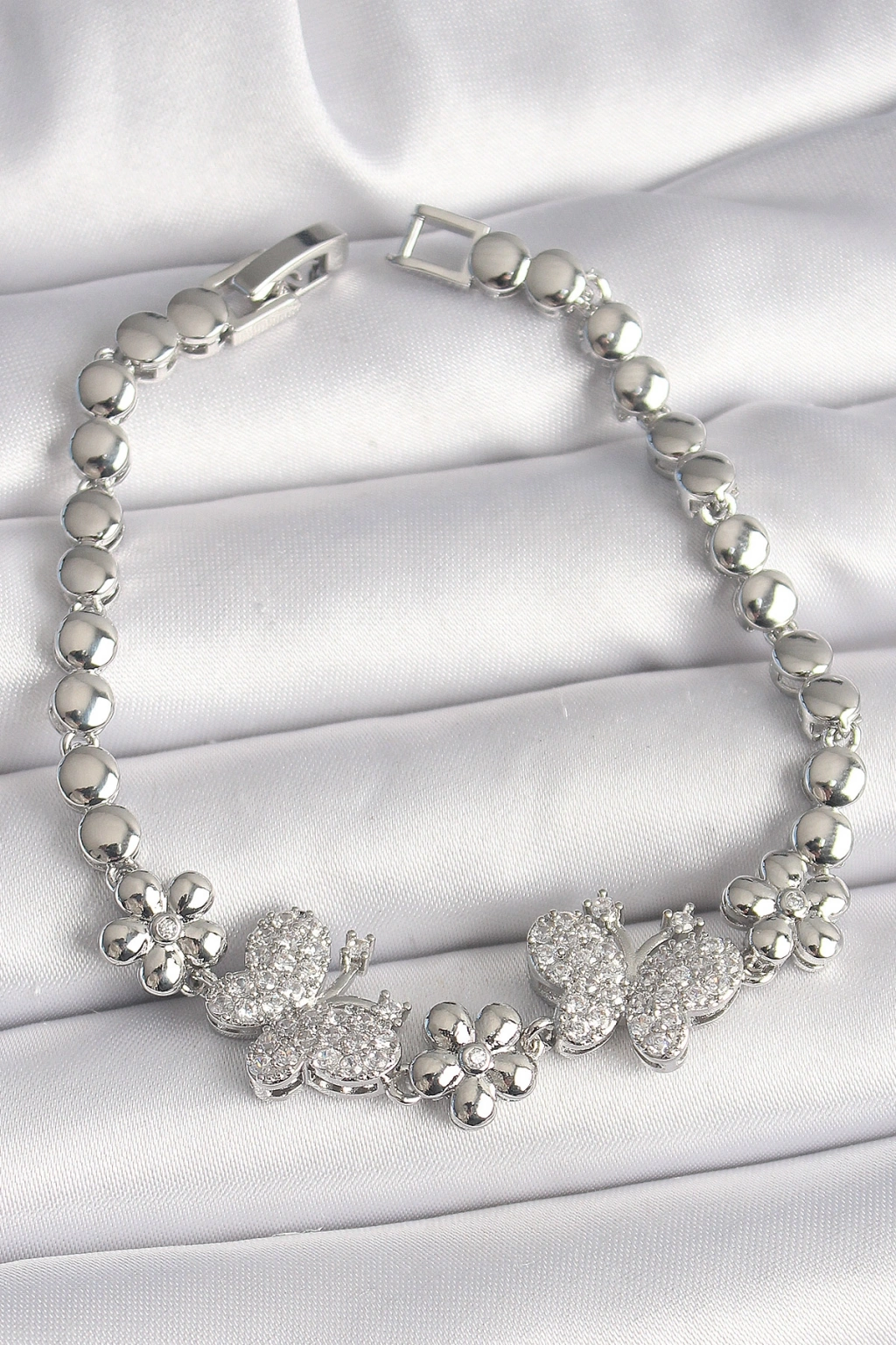 Pirinç Gümüş Renk Zirkon Taşlı Kelebek Figür Çiçek Zincir Model Kadın Bileklik