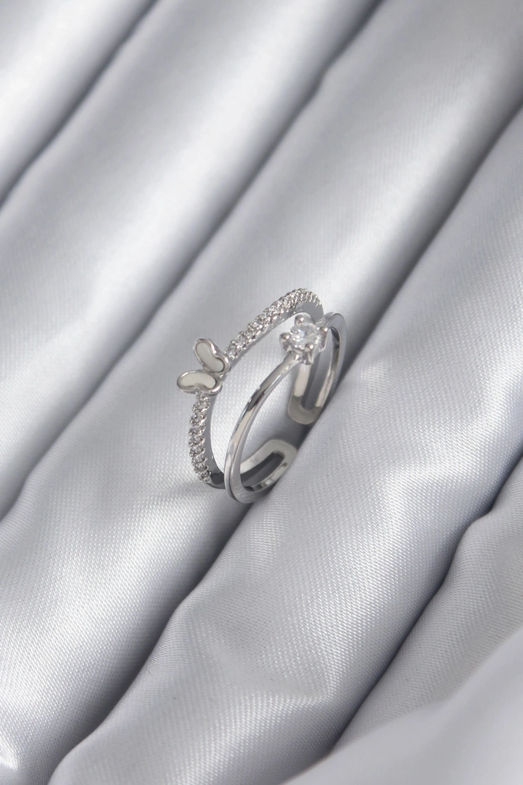 Pirinç Gümüş Renk Zirkon Taşlı Kelebek Model Kadın Yüzük