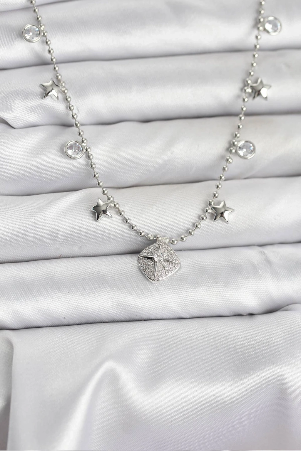 Pirinç Gümüş Renk Zirkon Taşlı Kutup Yıldızı Model Kadın Kolye