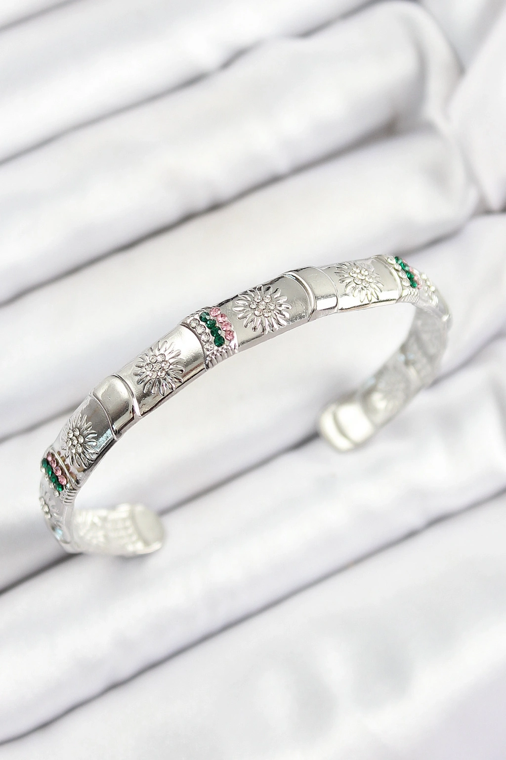 Pirinç Karışık Zirkon Taşlı Çiçek Model Gümüş Renk Altı Açık Kadın Bileklik