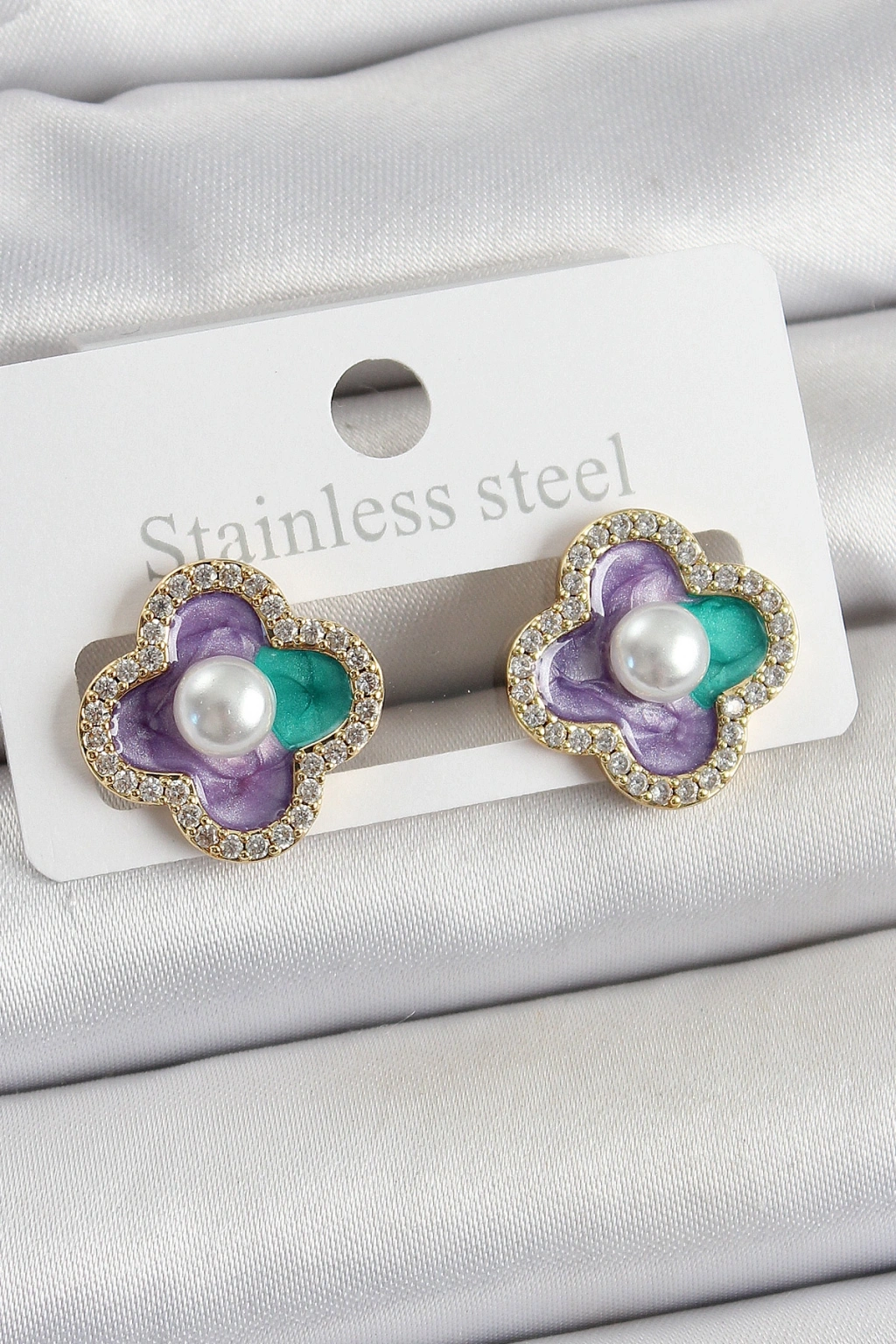 Pirinç Mor Mineli İnci Detaylı Zirkon Taşlı Sanatsal Portre Yonca Model Gold Renk Kadın Küpe