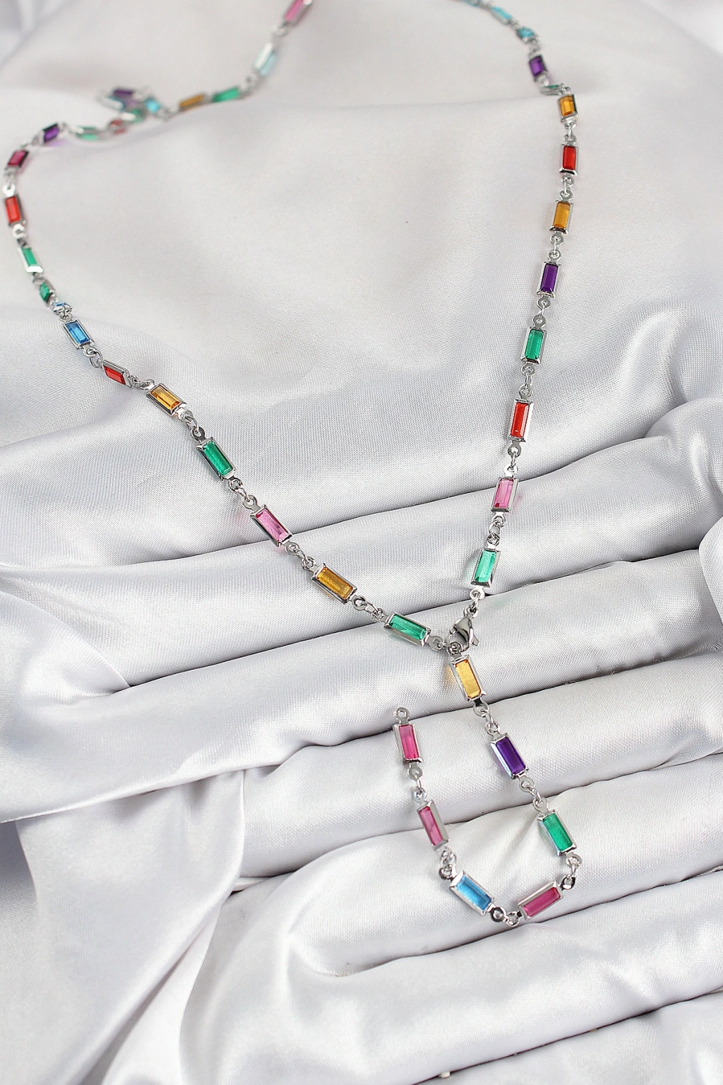 Pirinç Renkli Zirkon Taşlı Dikdörtgen Model Gümüş Renk Kadın Y Kolye