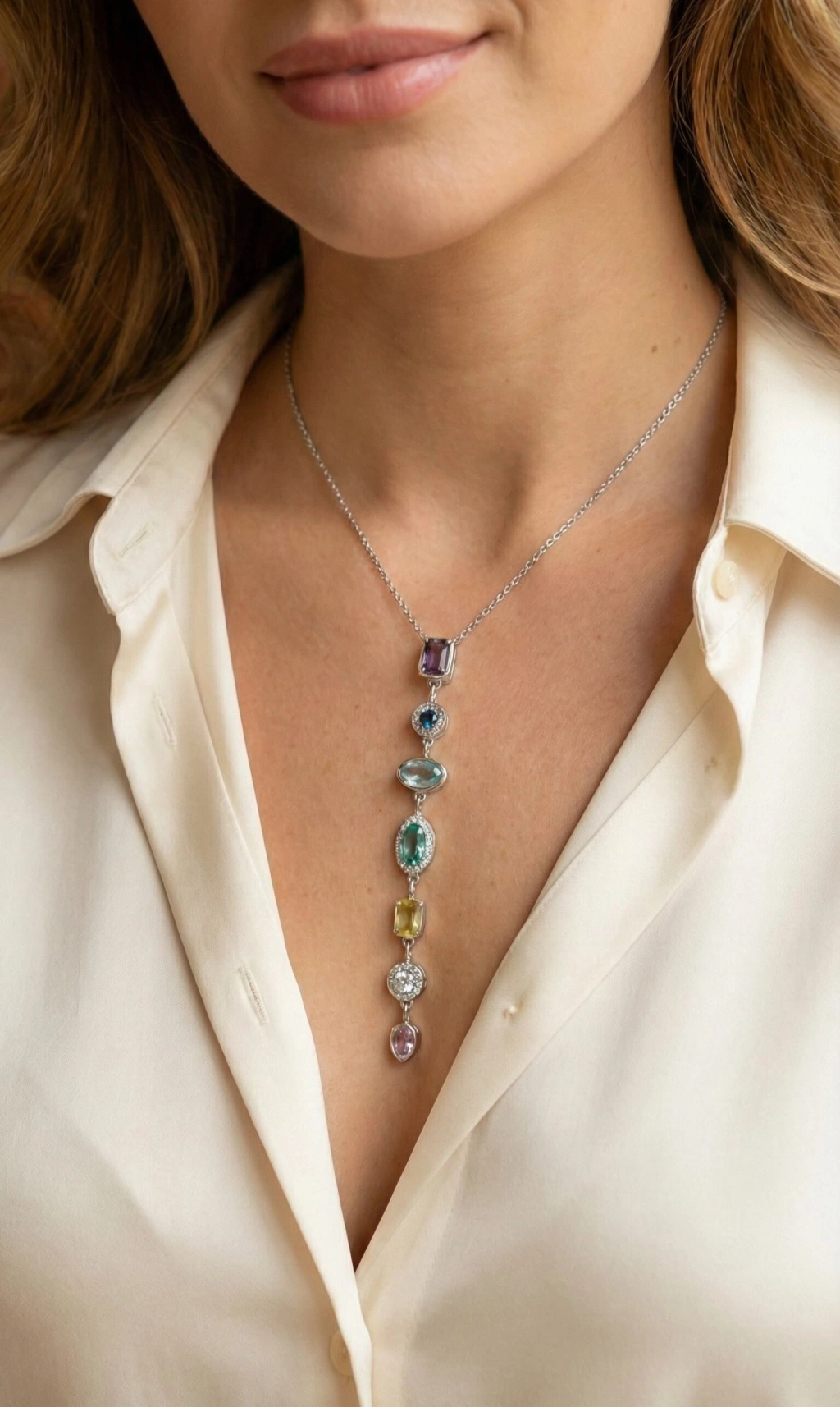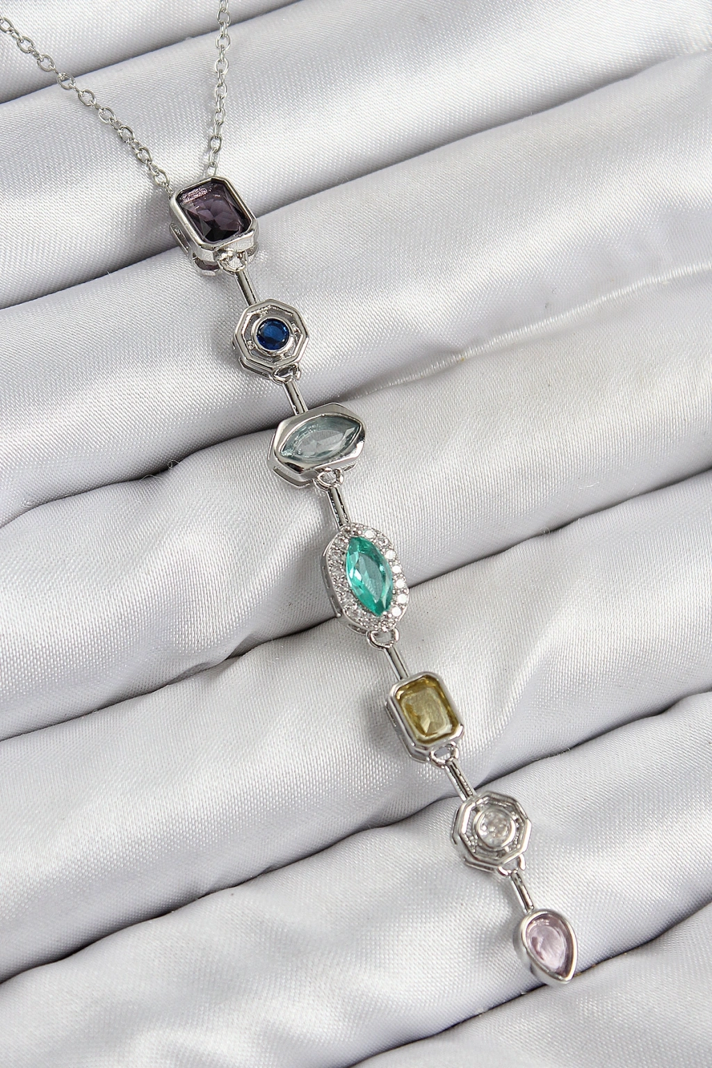 Pirinç Renkli Zirkon Taşlı Model Gümüş Renk 7 Element Kadın Y Kolye