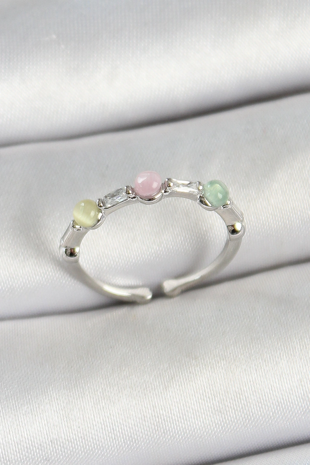 Pirinç Sıralı Boncuk Figürlü Zirkon Taşlı Gümüş Renk Ayarlanabilir Kadın Yüzük