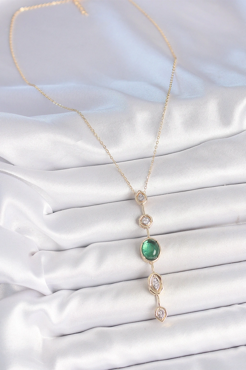 Pirinç Zincir Zümrüt Yeşil Gold Renk Zirkon Taşlı Y Kolye