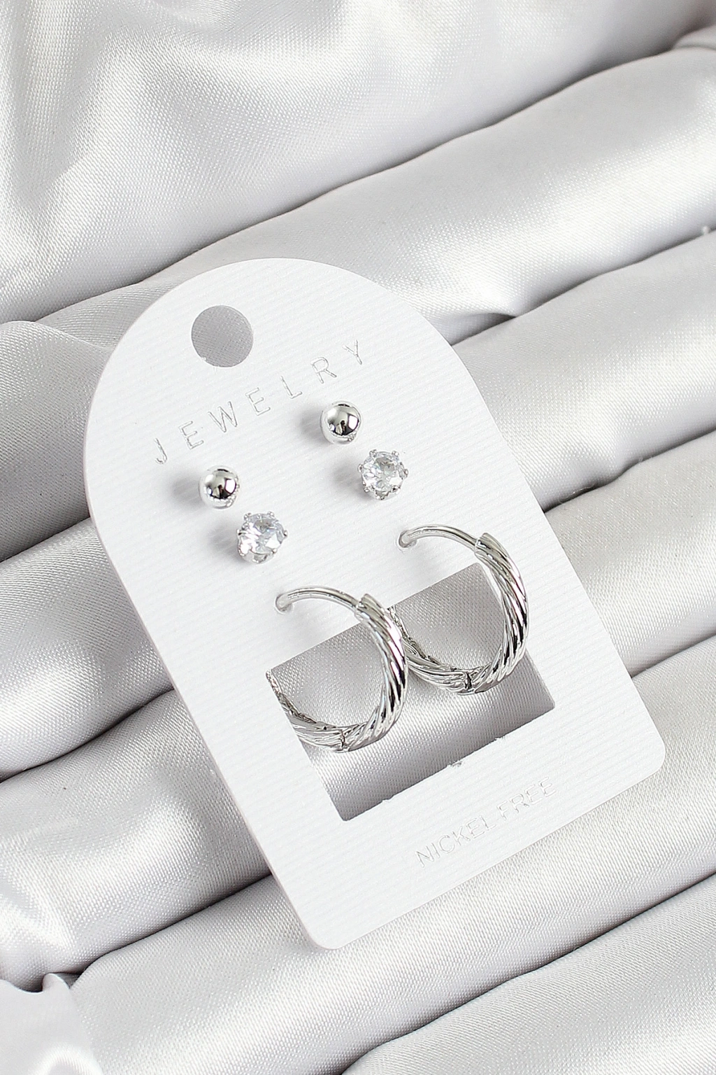 Pirinç Zirkon Taş Ve Halka Figürlü Gümüş Renk 3'lü Çift Kadın Küpe Set