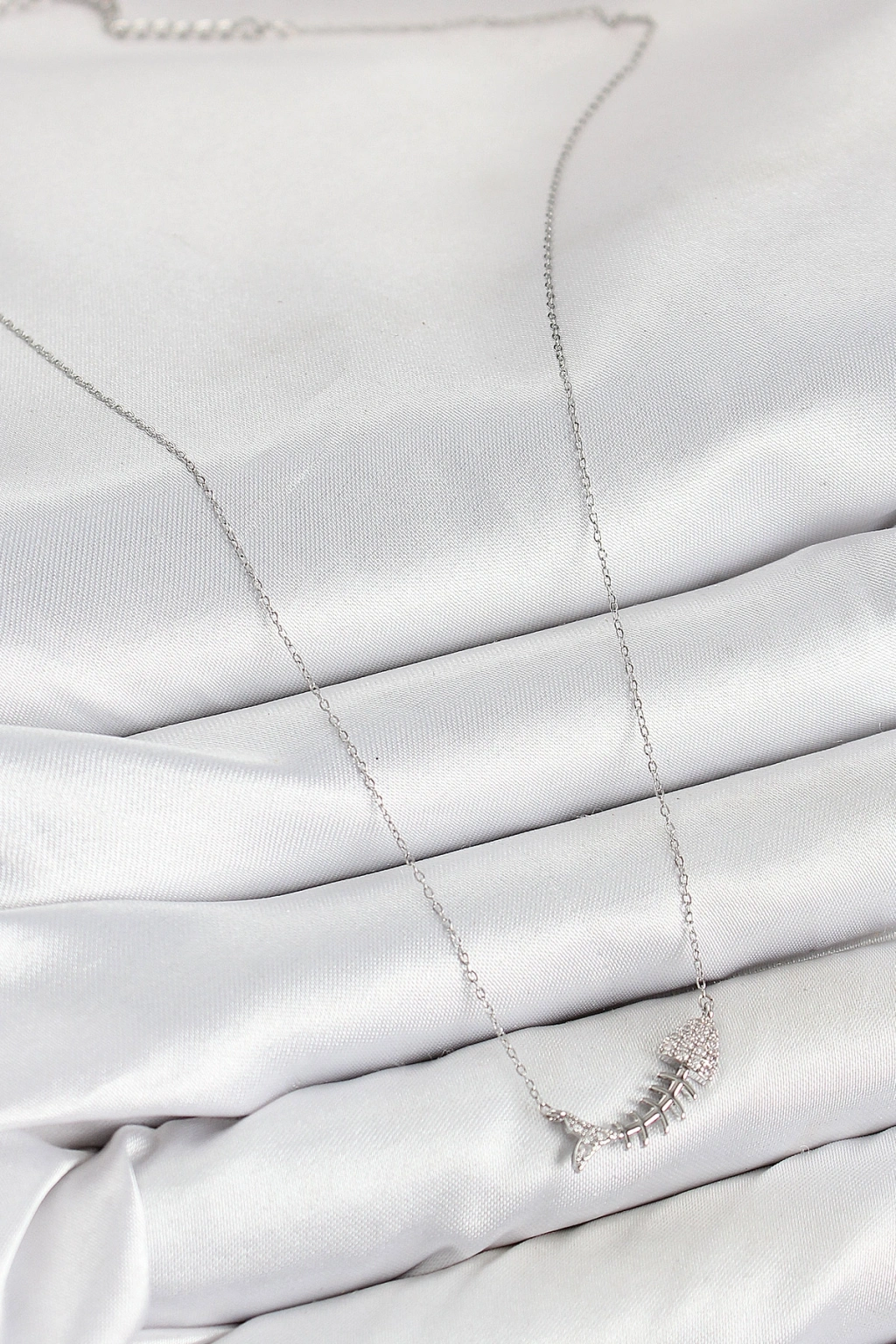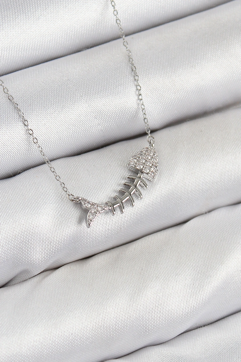 Pirinç Zirkon Taşlı Balık Kılçığı Model Gümüş Renk Kadın Kolye
