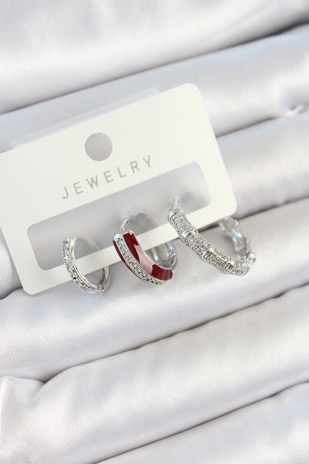 Pirinç Zirkon Taşlı Bordo Pembe Halka Model Gümüş Renk 3'lü Çift Kadın Küpe Set