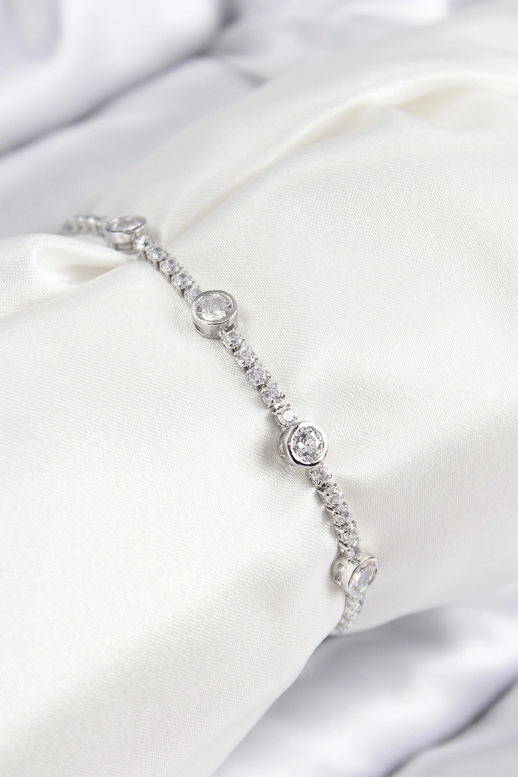 Pirinç Zirkon Taşlı Daire Model Gümüş Renk Asansörlü Kadın Bileklik