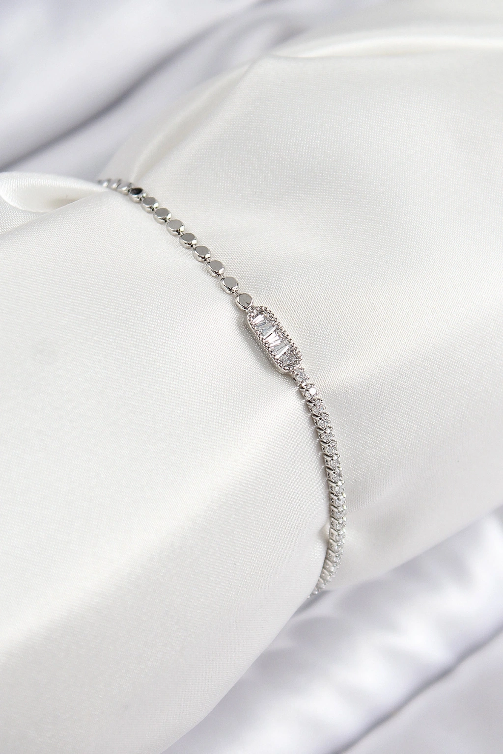 Pirinç Zirkon Taşlı Dikdörtgen Model Ezme Zincir Gümüş Renk Kadın Bileklik