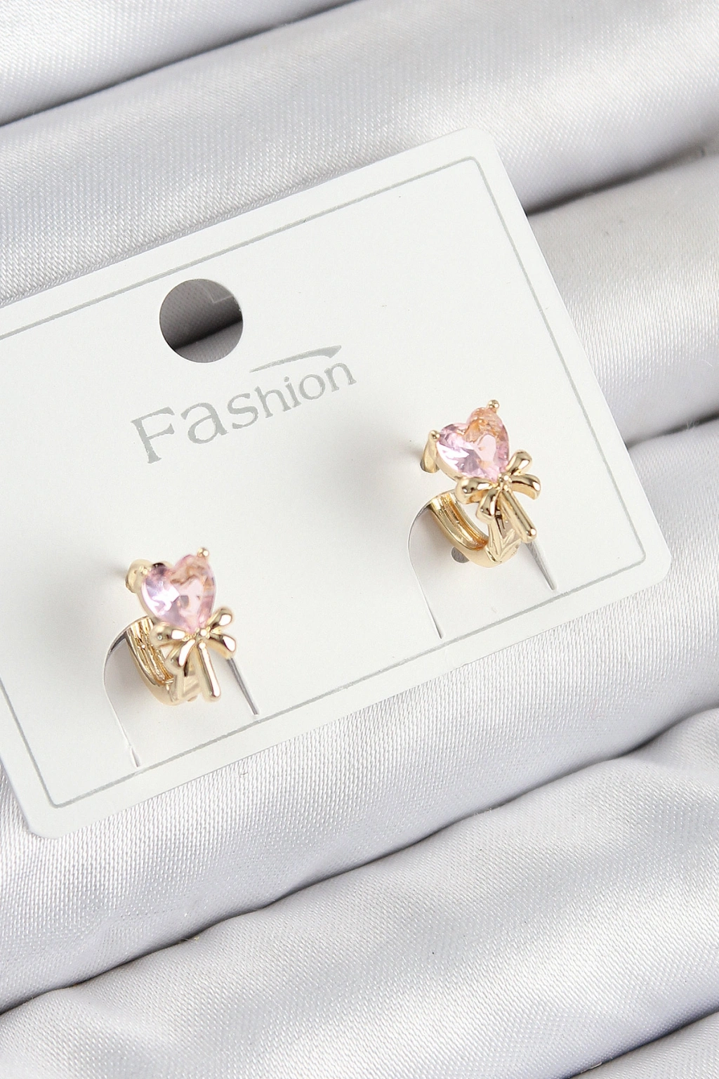 Pirinç Zirkon Taşlı Fiyonklu Kalp Model Gold Renk Çocuk Küpe