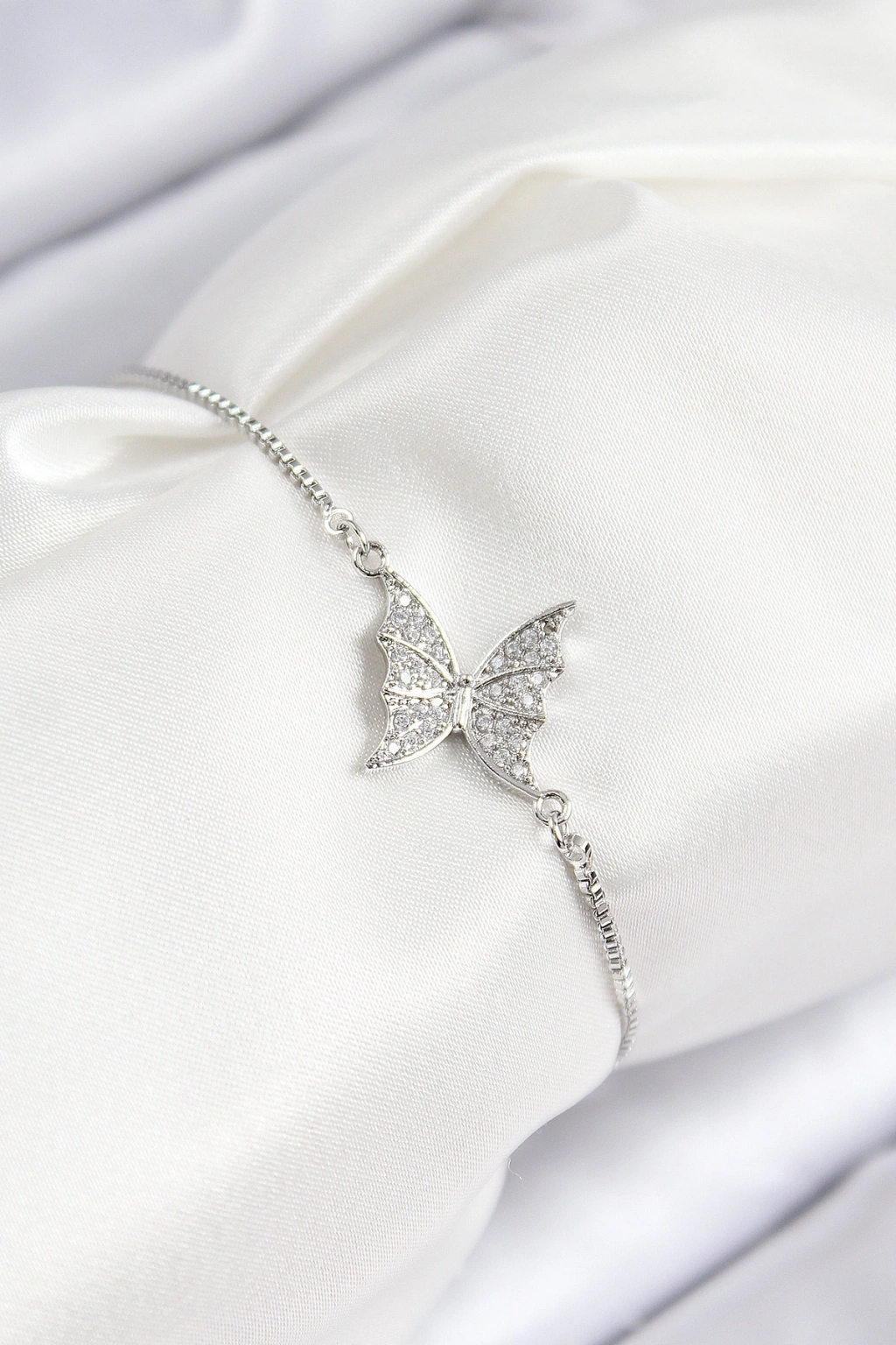 Pirinç Zirkon Taşlı Kelebek Model Gümüş Renk Asansörlü Kadın Bileklik