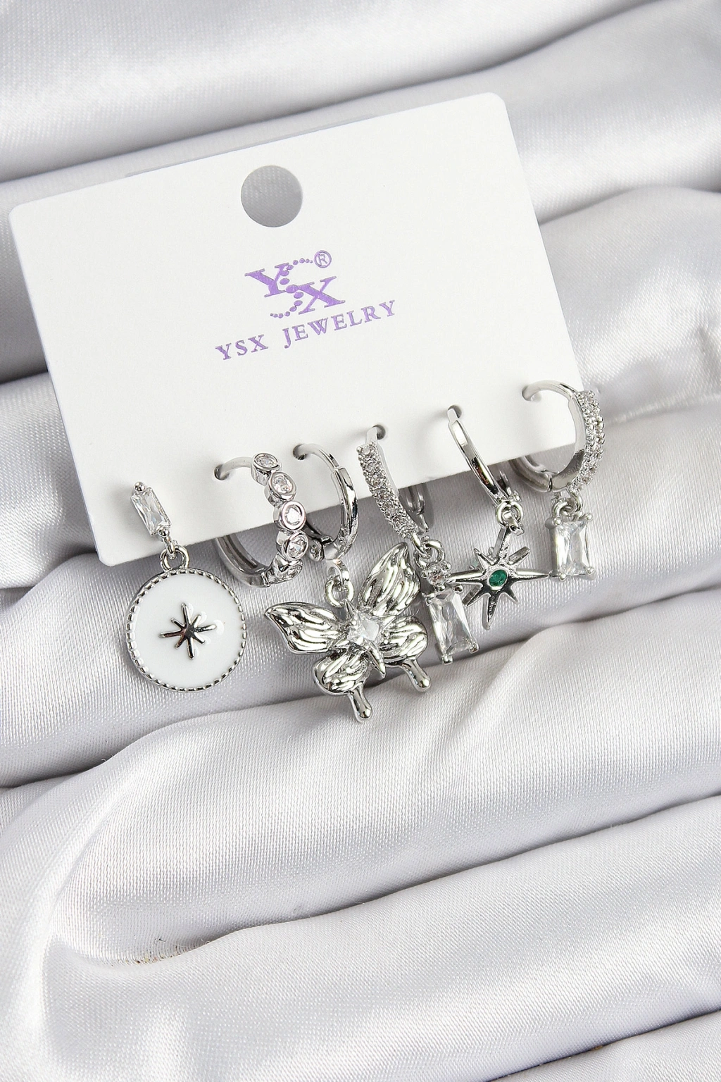 Pirinç Zİrkon Taşlı Kelebek ve Yıldız Model Gümüş Renk 3'lü Çift Kadın Küpe
