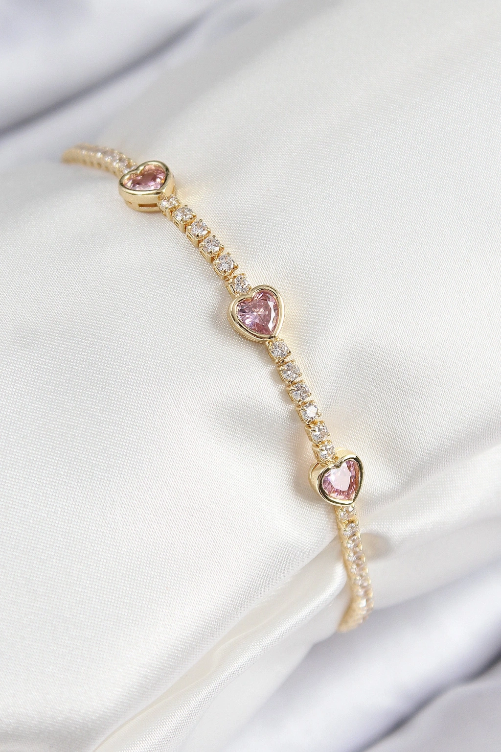 Pirinç Zirkon Taşlı Pembe Kalp Model Gold Renk Kadın Bileklik