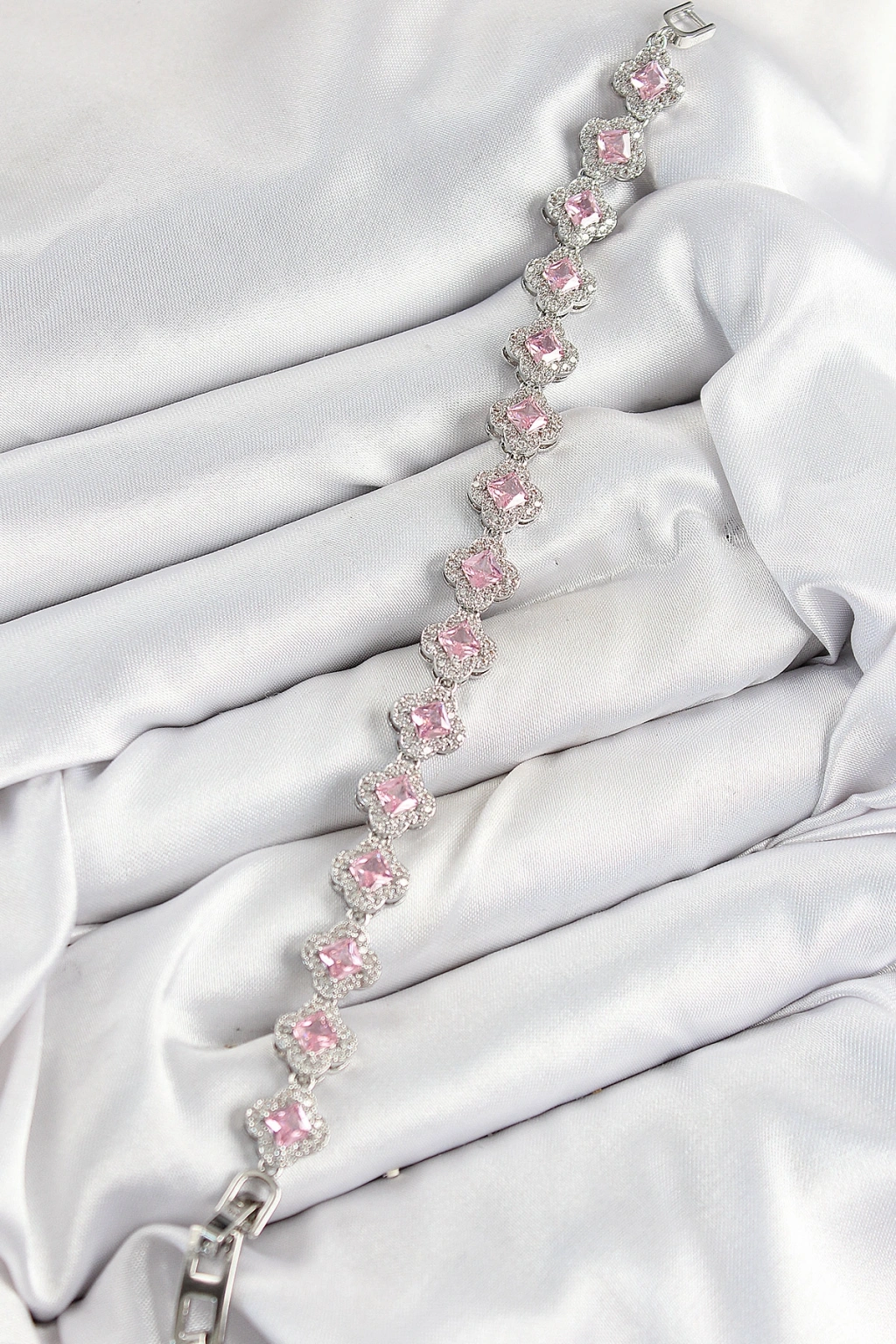 Pirinç Zirkon Taşlı Pembe Yonca Baget Model Gümüş Renk VIP Seri Kadın Bileklik