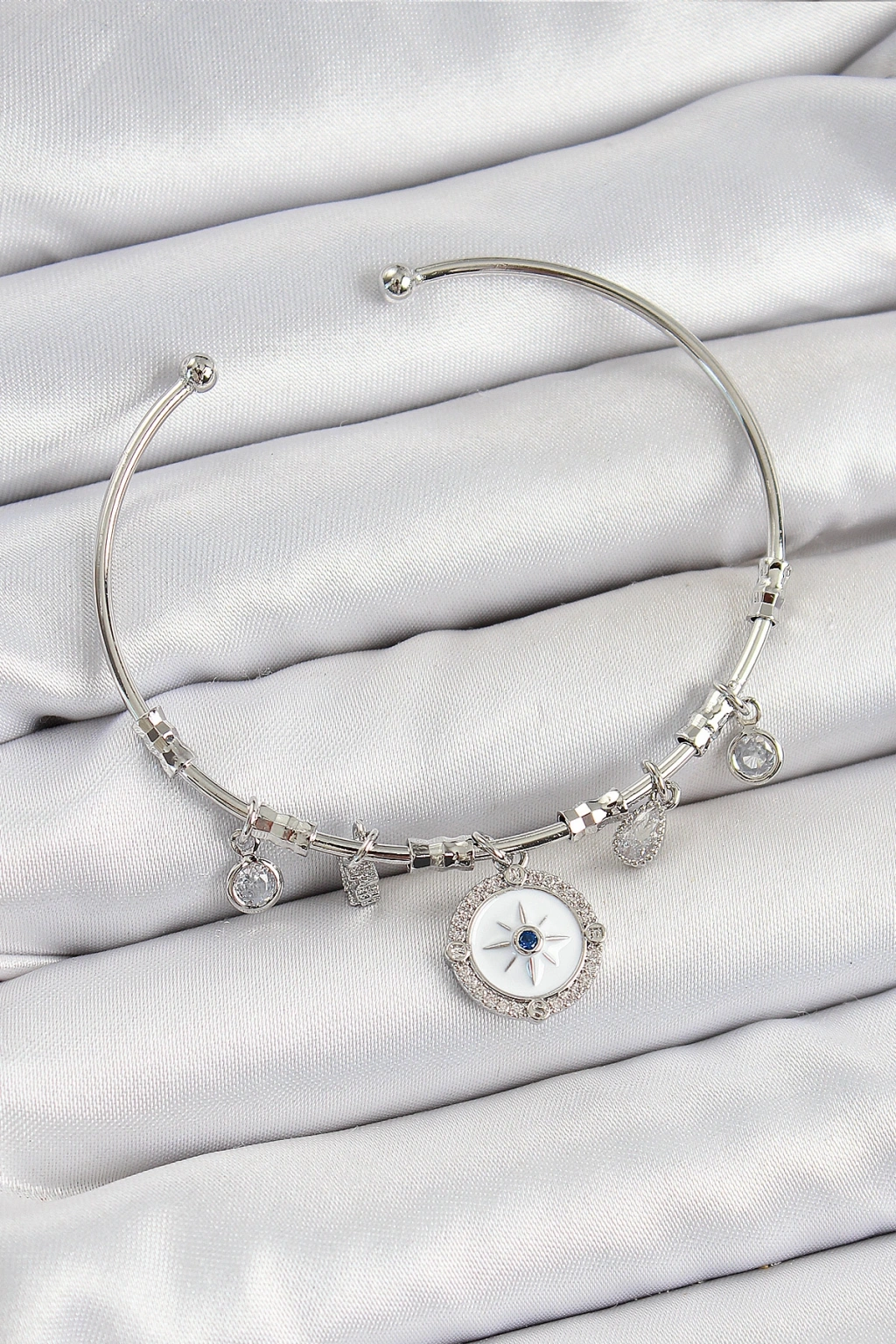 Pirinç Zirkon Taşlı Pusula Model Gümüş Renk Charm Bileklik