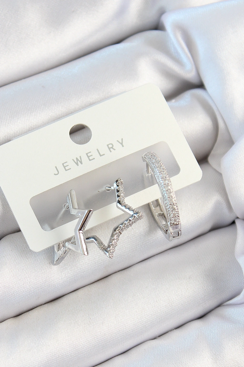 Pirinç Zirkon Taşlı Yıldız Ve Halka Model Gümüş Renk 3'lü Çift Kadın Küpe Set